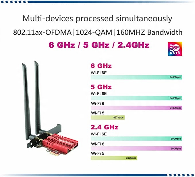 Адаптер Wi-Fi Ziyituod AX210 із технологією Wi-Fi наступного покоління 802.11ax (WIFI 6E) підніме Wi-Fi на вашому робочому столі на новий рівень. Підтримує діапазон 2,4 ГГц/5 ГГц/6 ГГц для всіх пристроїв, забезпечуючи швидкість бездротової передачі до 5400 Мбіт/с. Легко для AR/VR, потокового онлайн-відео 4K/4K/4K8K Ultra HD.