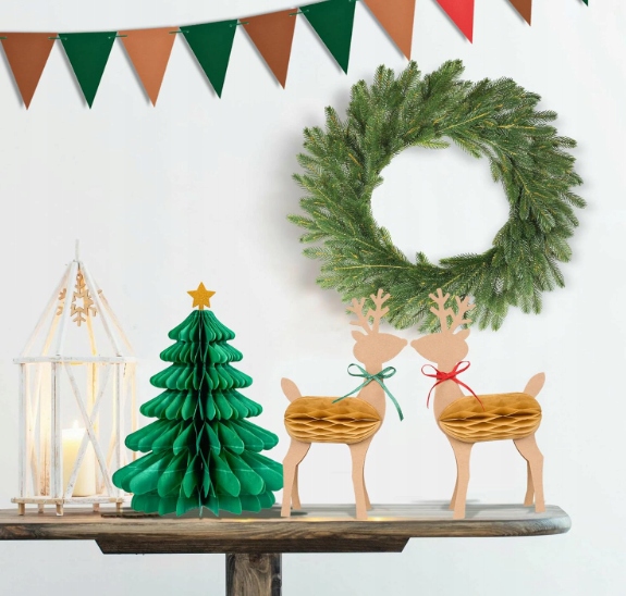 Пакет включає: банер MERRY CHRISMAS*1, паперову ялинку*1, 3D-орнамент з оленями*2, кольорові паперові віяла*6, паперові віяла зі сніжинками*2, паперові дзвіночки*1, трикутний прапор*1. Продукти багаті/барвисті, а оригінальні тривимірні стільники можна швидко відкривати та складати, що дозволяє швидко створити святкову атмосферу.
