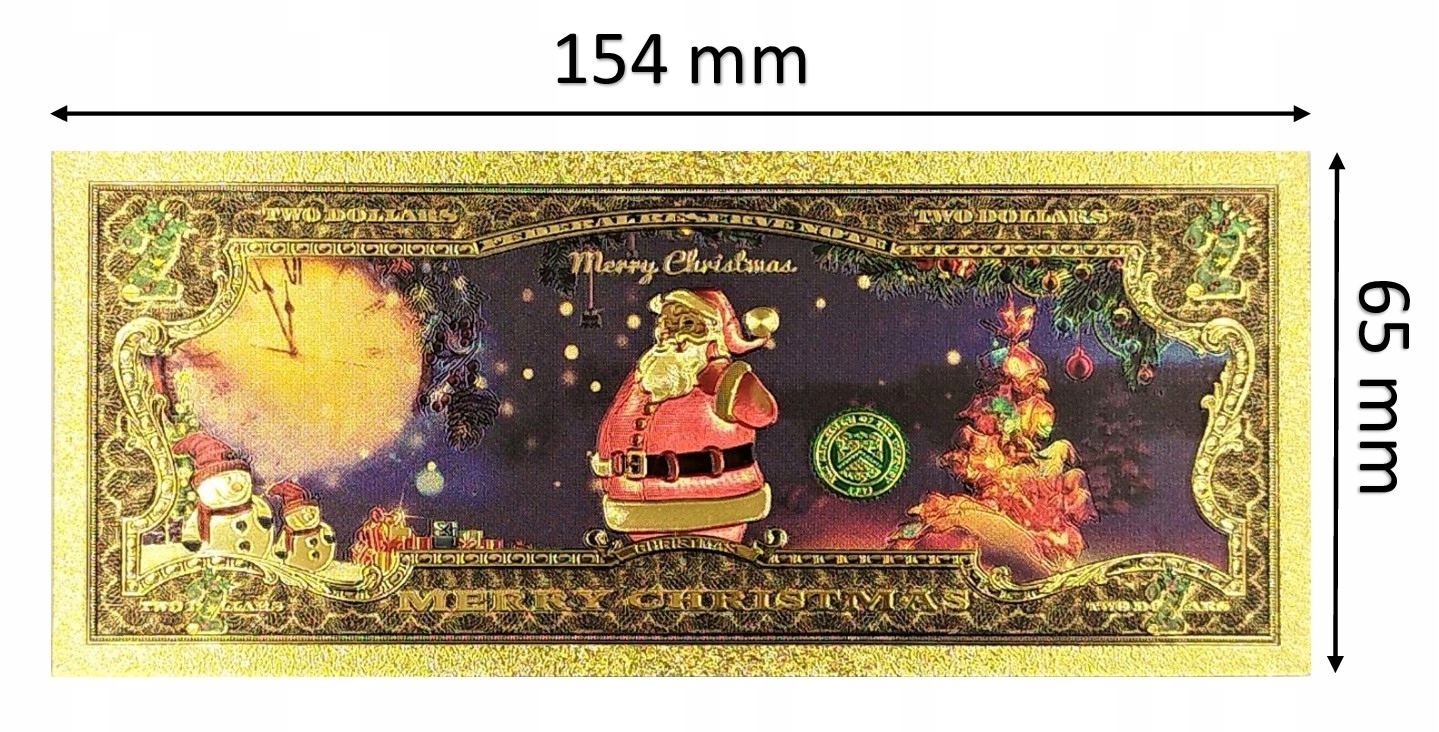 Елегантна різдвяна банкнота із зображенням Санта-Клауса. Цікава пропозиція для любителів різноманітних гаджетів та унікальних подарунків. Різдвяна тема робить його ідеальною ідеєю для різдвяного подарунка. Форма банкноти взята з американського долара, але номінал лише символічний.