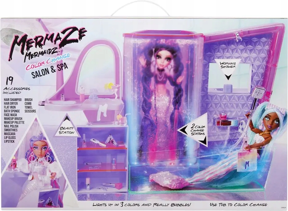 Час трохи відпочити! Відчуйте спокійний день із Mermaze Mermaidz! Підсвічування душу сяє рожевим, фіолетовим і блакитним кольорами та створює атмосферу. У спа-салоні є 2 станції, і ви вирішуєте, де ваші ляльки змінюють колір - у кабіні чи у ванні. Наповніть ванну водою відповідної температури та занурте свою ляльку Mermaze Mermaidz, щоб змінити колір. Спостерігайте за бульбашками води та різнокольоровими лампочками, що спалахують, коли ви вмикаєте світло. У комплекті є робочий душ - натисніть на кнопку, щоб побачити тече вода з душової лійки! Також є туалетний столик для русалок - Mermaze Mermaidz любить змінювати свою зовнішність і відпочивати у вітальні. Використовуйте іграшковий фен, макіяж, засоби для волосся та маску для обличчя, щоб побалувати своїх ляльок.