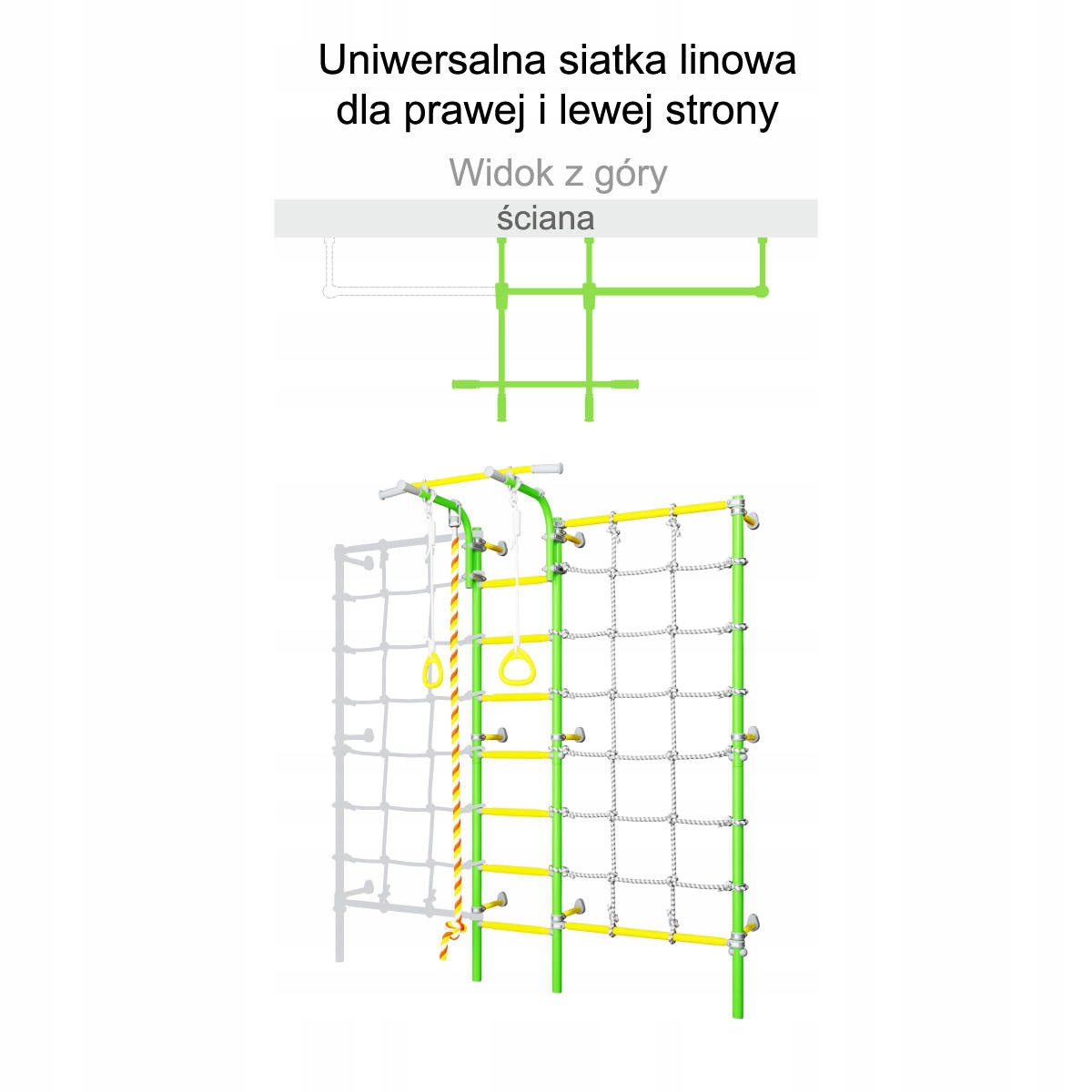 Гімнастична драбина наступна 3-3 Комет-одна з найбідніших настінних подарунків, в яких, крім класичної металевої вправи Next-1, ми також знаходимо стіну, виготовлену з струнної сітки для підйому, розтягнутого між сходи та стіною. Нестабільна сходження сітки розвиває координацію рухів у дітей, а також здійснює глибокі м’язи, відповідальні за правильну поставу тіла. Наступний-1, що входить до набору, має регульований стрижень та регульовані кріпильні рукави до стіни.