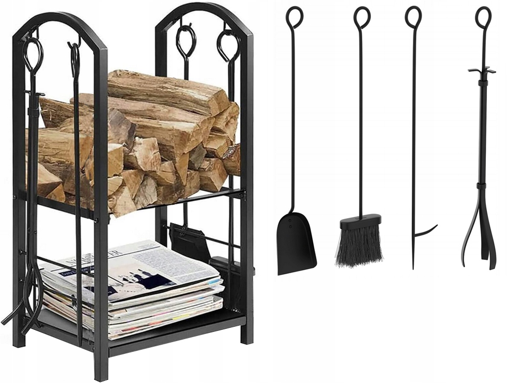 МЕТАЛЕВА ПІДСТАВКА ДЛЯ ДРОВІН З АКСЕСУАРАМИ ПОЛИЦЯ КОШИК КАМІННИЙ НАБІР