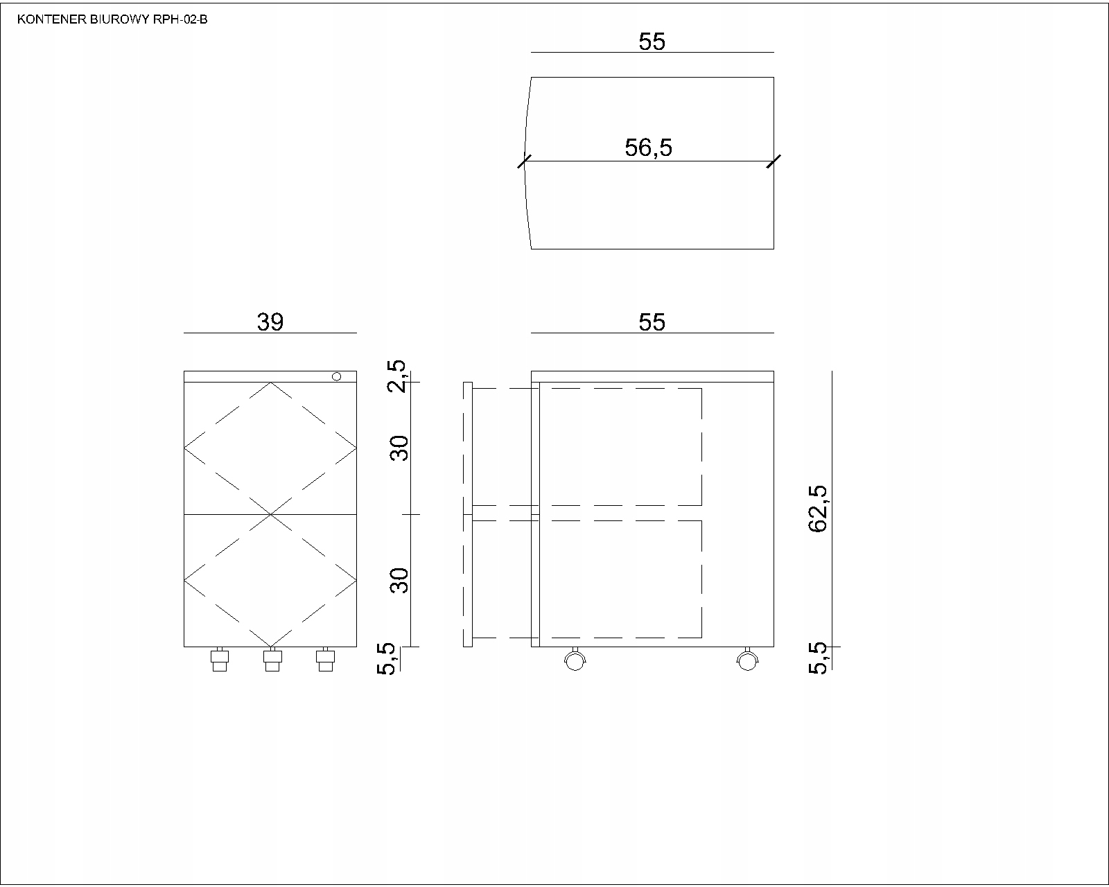 Офісний контейнер РПХ-02 металевий, пофарбований в один із трьох доступних кольорів: білий, чорний або сріблястий. Він оснащений 2 місткими ящиками для файлів. Має циліндровий замок, який дозволяє замкнути контейнер на ключ.