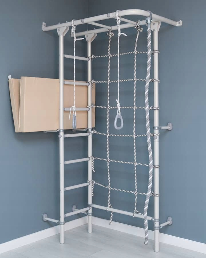 Настінна драбина Next 4 призначена для установки в кутку кімнати. Сучасний спортивний комплект із сіткою-струною дозволяє оптимально використовувати простір у квартирі. Дитяча драбина Next 4 допоможе вам розвинути силу рук за допомогою горизонтальної драбини. Дитячий ігровий набір має оригінальний дизайн і розташування елементів. На горизонтальну драбину можна повісити різні спортивні аксесуари. У набір входить мотузка, акробатичні кільця і сітка для лазіння шириною 70 см з міцної мотузки. Конструкція витримує навантаження 100 кг. Гімнастичну драбину Kometa Next 4 можна встановити в дзеркальному відображенні, тобто ми монтуємо сітку з обох боків гімнастичної драбини та встановлюємо її як завгодно.