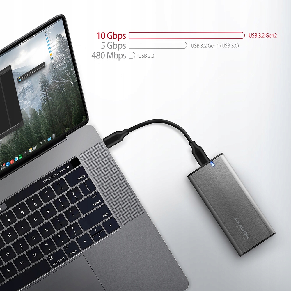 Друге покоління швидкого інтерфейсу USB дозволяє використовувати швидкість сучасних накопичувачів M.2 SSD. Завдяки швидкому інтерфейсу USB 3.2 Gen 2 швидкість передачі становить до 10 Гбіт/с. Зовнішній блок M.2 також підтримує інші сучасні функції, наприклад, UASP, TRIM і дозволяє зчитувати інформацію S.M.A.R.T. моніторинг стану диска. Підтримка режиму очікування.
