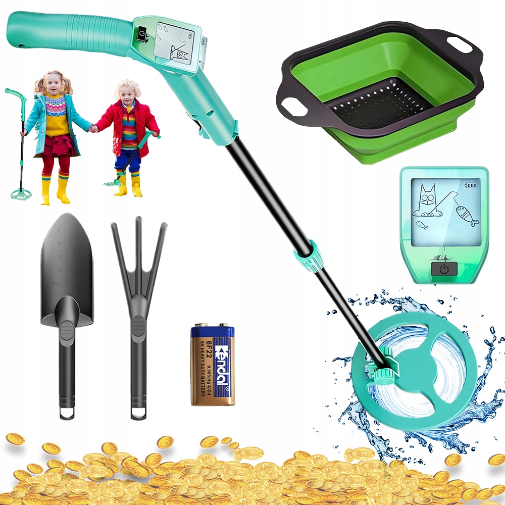 - У наборі ви отримаєте не тільки металошукач для дітей, але й батарею 9В, а також лопатку, фільтр, підставку та портативну сумку для перенесення, з якою ваші діти зможуть насолоджуватися розвагами на природі.