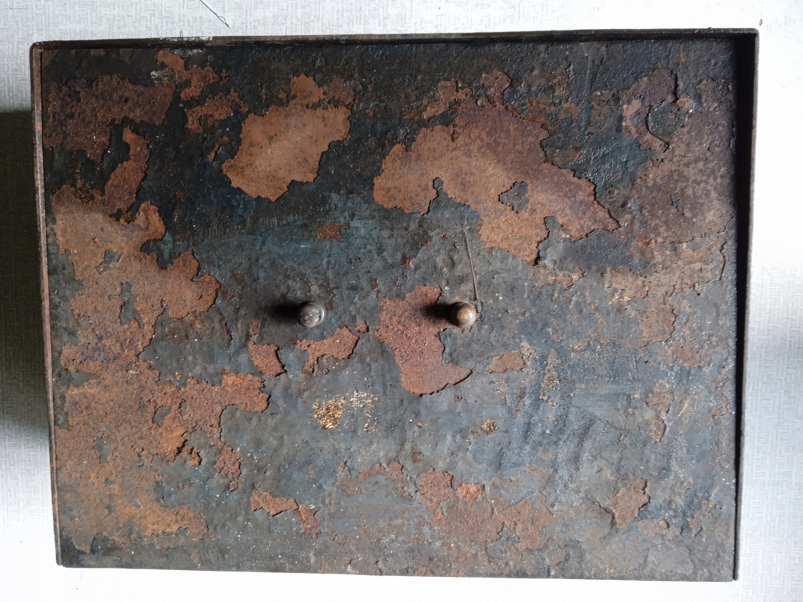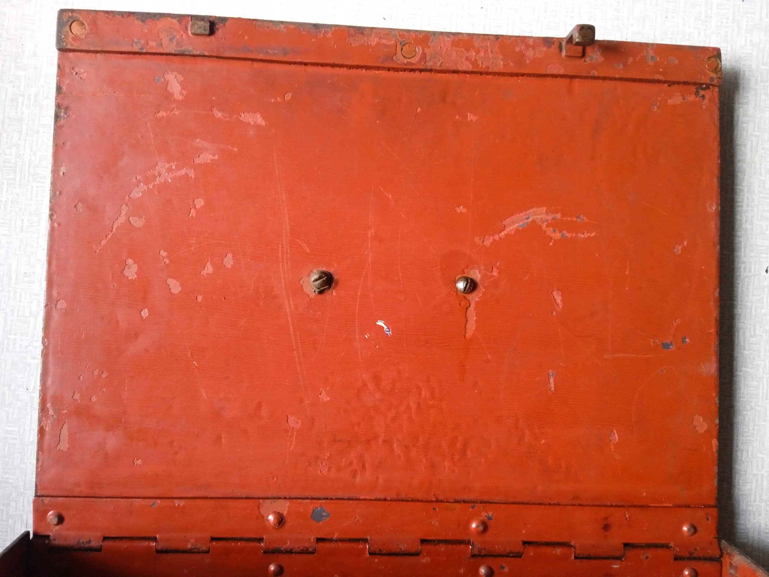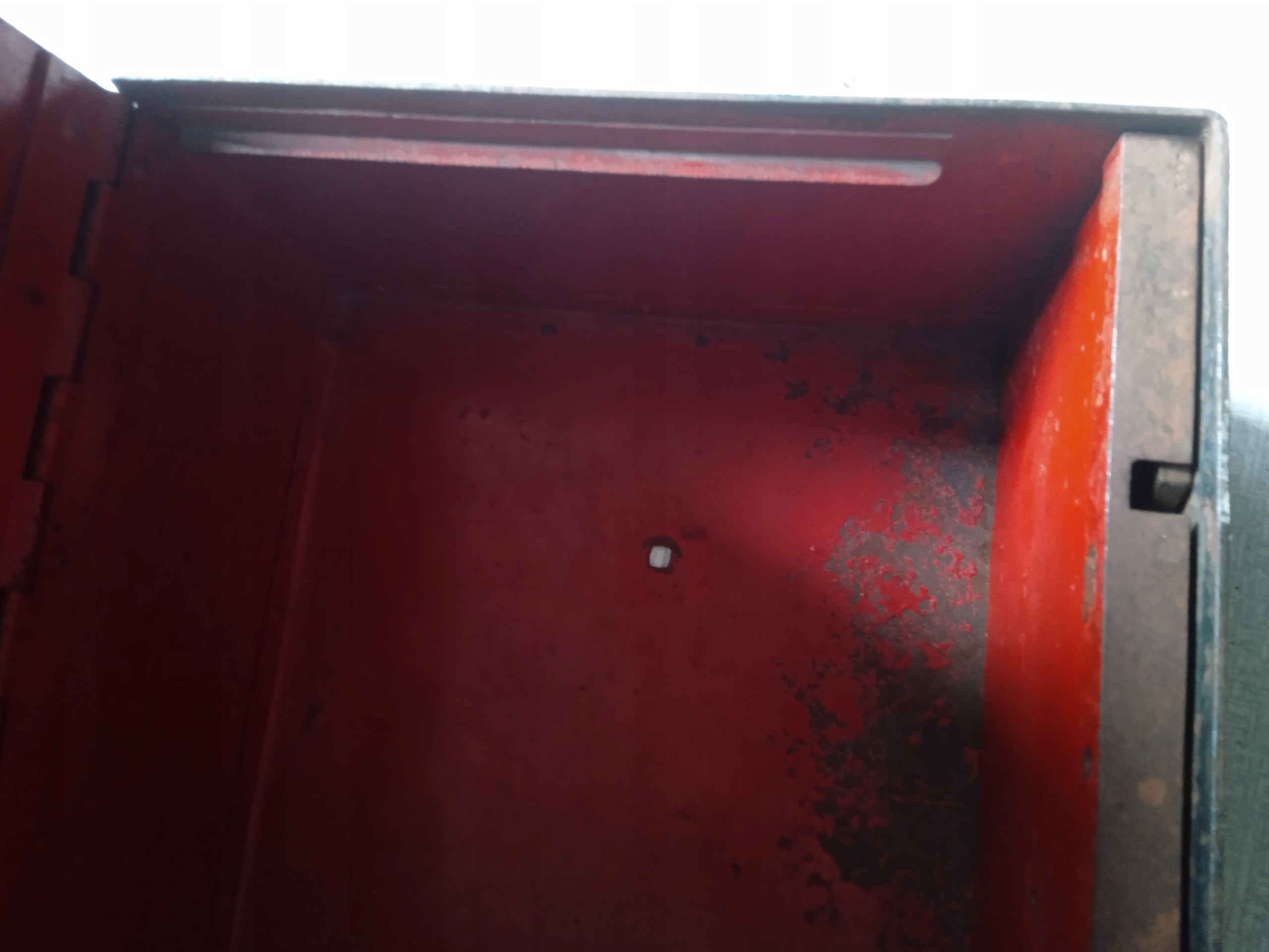 Продам металевий броньований чохол часів ПНР - 1960-1970-х років. Даний вид касет використовувався на міських касах або у відділеннях ГС. Ящик виготовлений з товстого сталевого листа. У нижній частині є два отвори, в які були вкручені гвинти, щоб закріпити касету на столі або шафі. По всій довжині передньої стінки суцільна блискавка. Розміри: 34 х 26 х 14,5 см. Стан досить добрий, але після кількох десятків років на горищі фарба, що вкривала ящик, майже повністю злізла, виявивши корозію, що вкрила метал. Тільки всередині коробки є майже неушкоджений шар оригінальної червоної фарби. Також відсутні ручка на клапані, яка закриває корпус зверху, і ключ від замка.