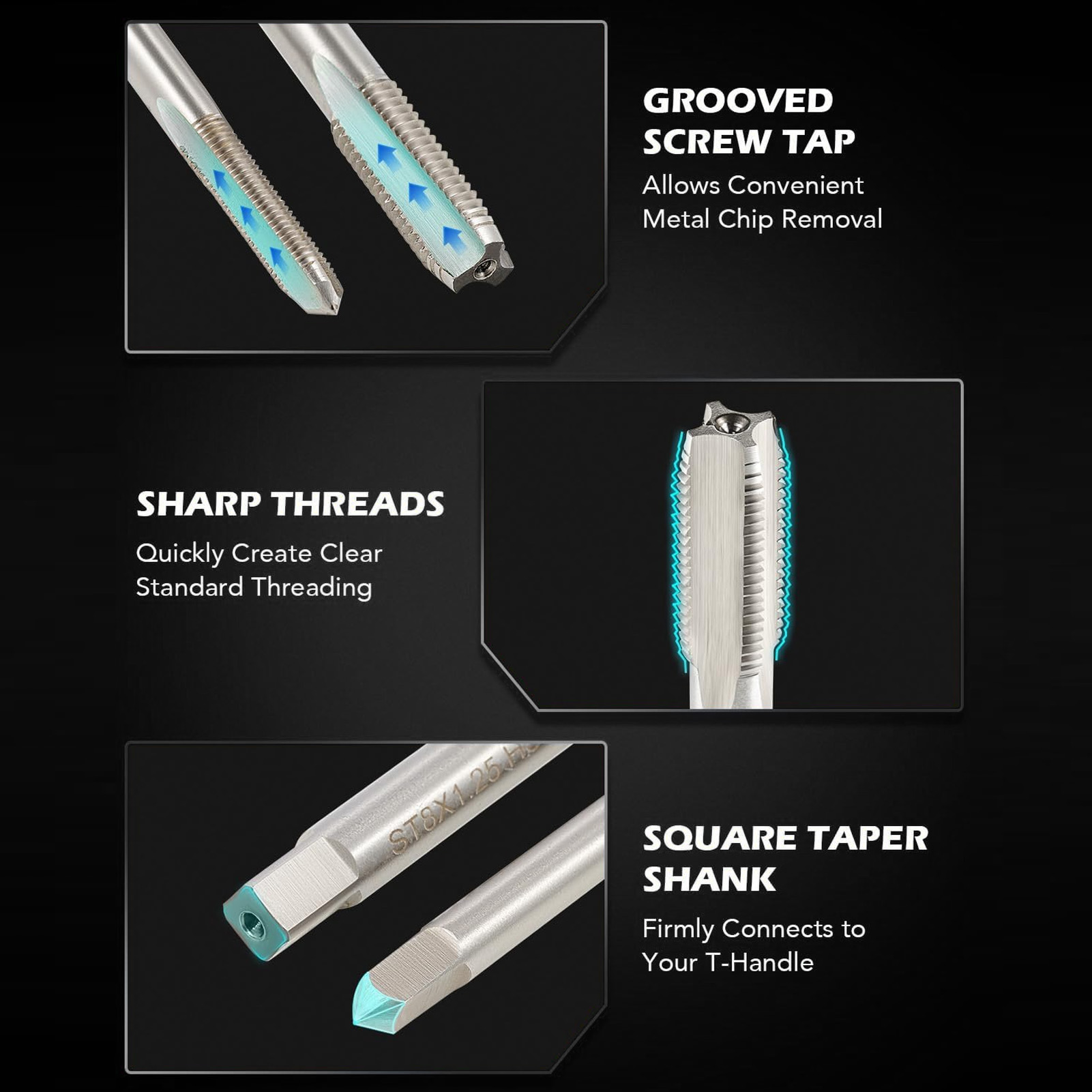 4. Універсальне використання: цей набір для ремонту різьби ефективно відновлює оголену, пошкоджену або зношену різьбу на різних матеріалах, включаючи алюміній, залізо, вуглецеву сталь, бронзу та MG, підходить для будь-якої ситуації ремонту!
