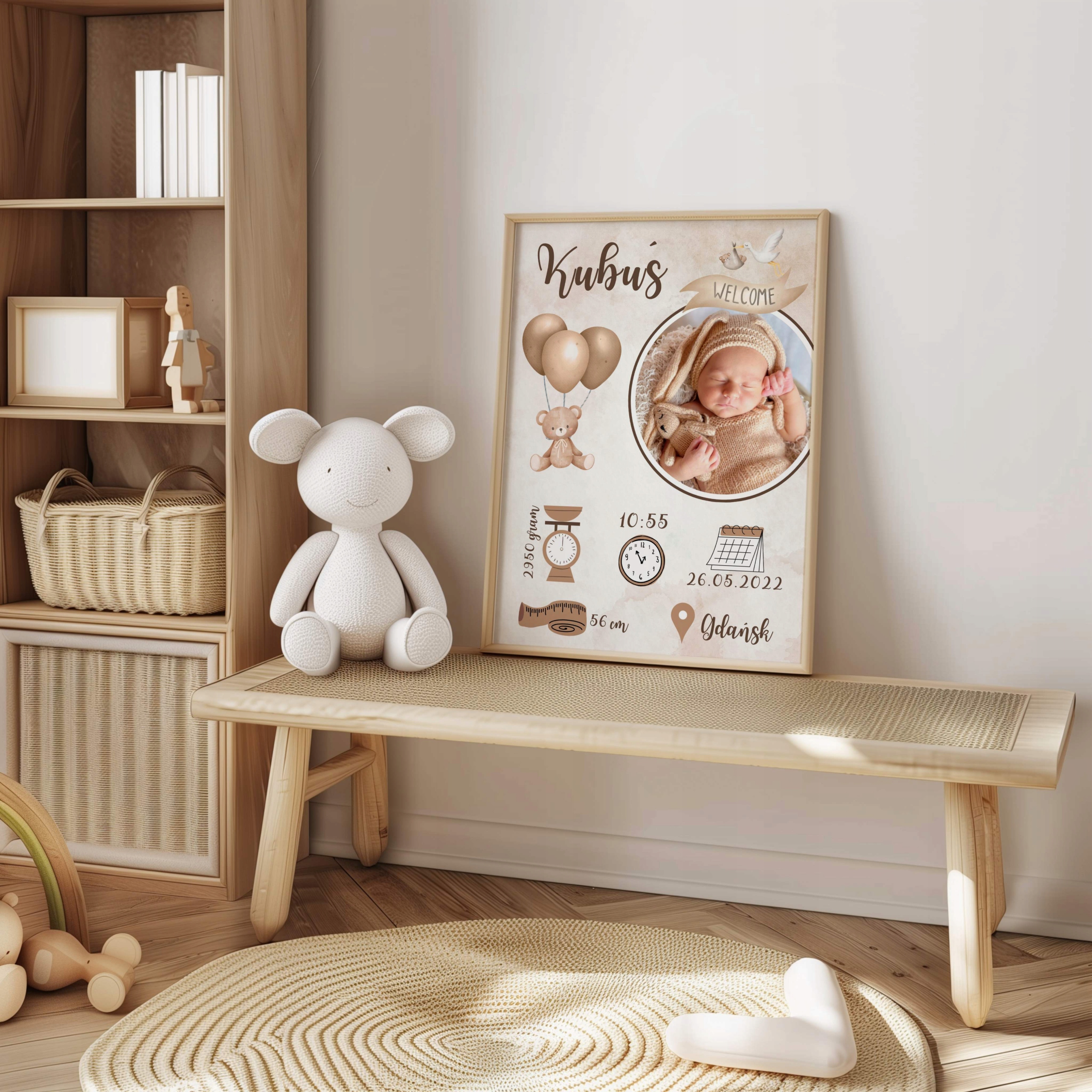 Метрика для дитячого хрещення Подарунок Фото день народження Ведмідь 30х40 Boho Beige
