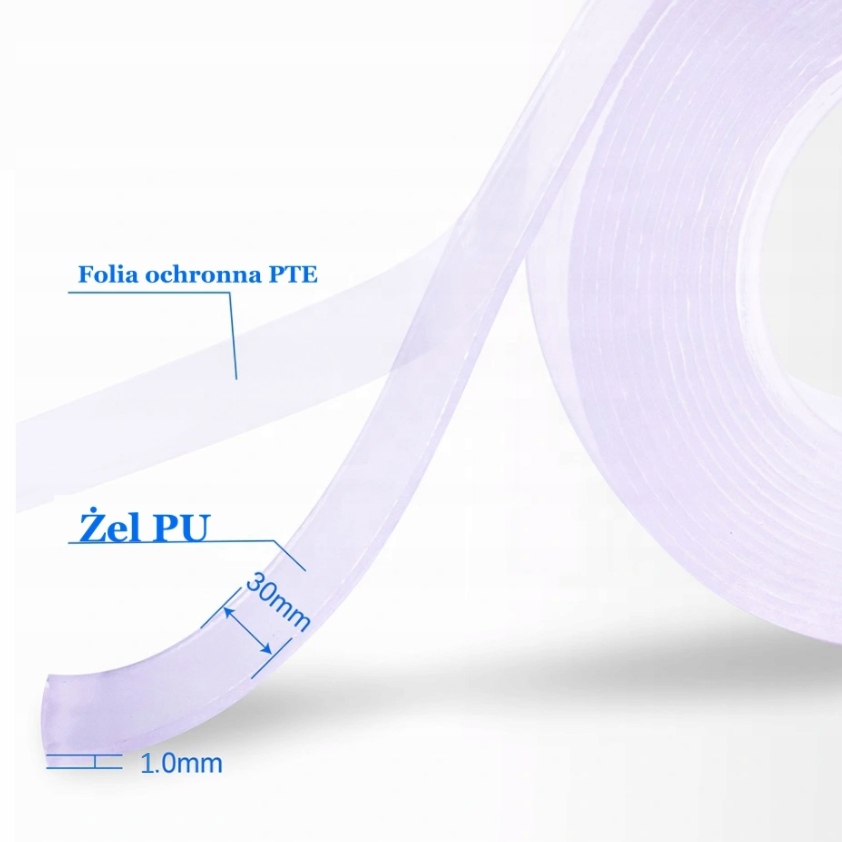 - Стрічка прозора. Його можна використовувати на різних гладких непористих поверхнях, таких як скло, мармур, метал, керамічна плитка, пластик або шкіра, стіни, вікна, двері, стільниці, кухонні шафи та ін.. Це альтернатива шпилькам, двостороннім скотч, а також цвяхи та дюбелі