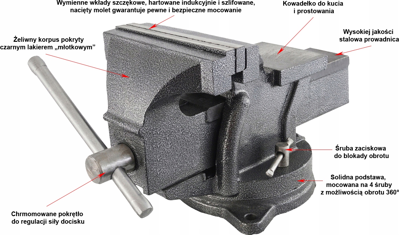 ✔️ Висока міцність і стійкість до пошкоджень - завдяки чавунному корпусу лещата надзвичайно стійкі, що означає точність і безпеку роботи.