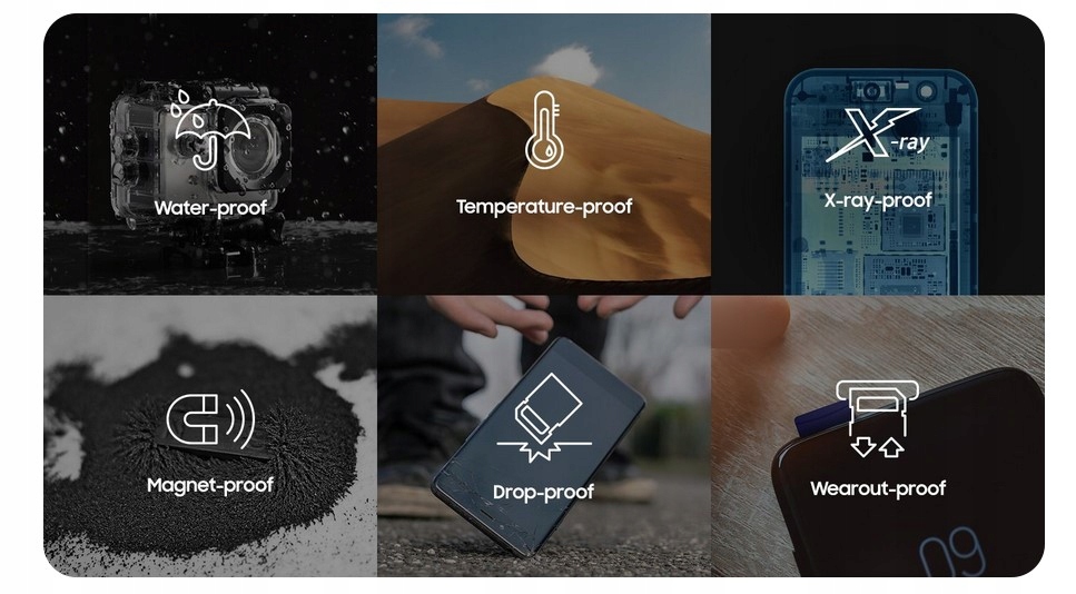 Ваш досвід незамінний – і безпечний. Карти EVO Plus захищені від шести загроз, тому вони можуть витримати до 72 годин занурення в морську воду, екстремальних температур, рентгенівського опромінення в аеропорту та численних падінь. Крім того, картки стійкі до зношування та магнітного поля, яке створює магнітно-резонансна томографія. Samsung надає на них 10-річну обмежену гарантію.