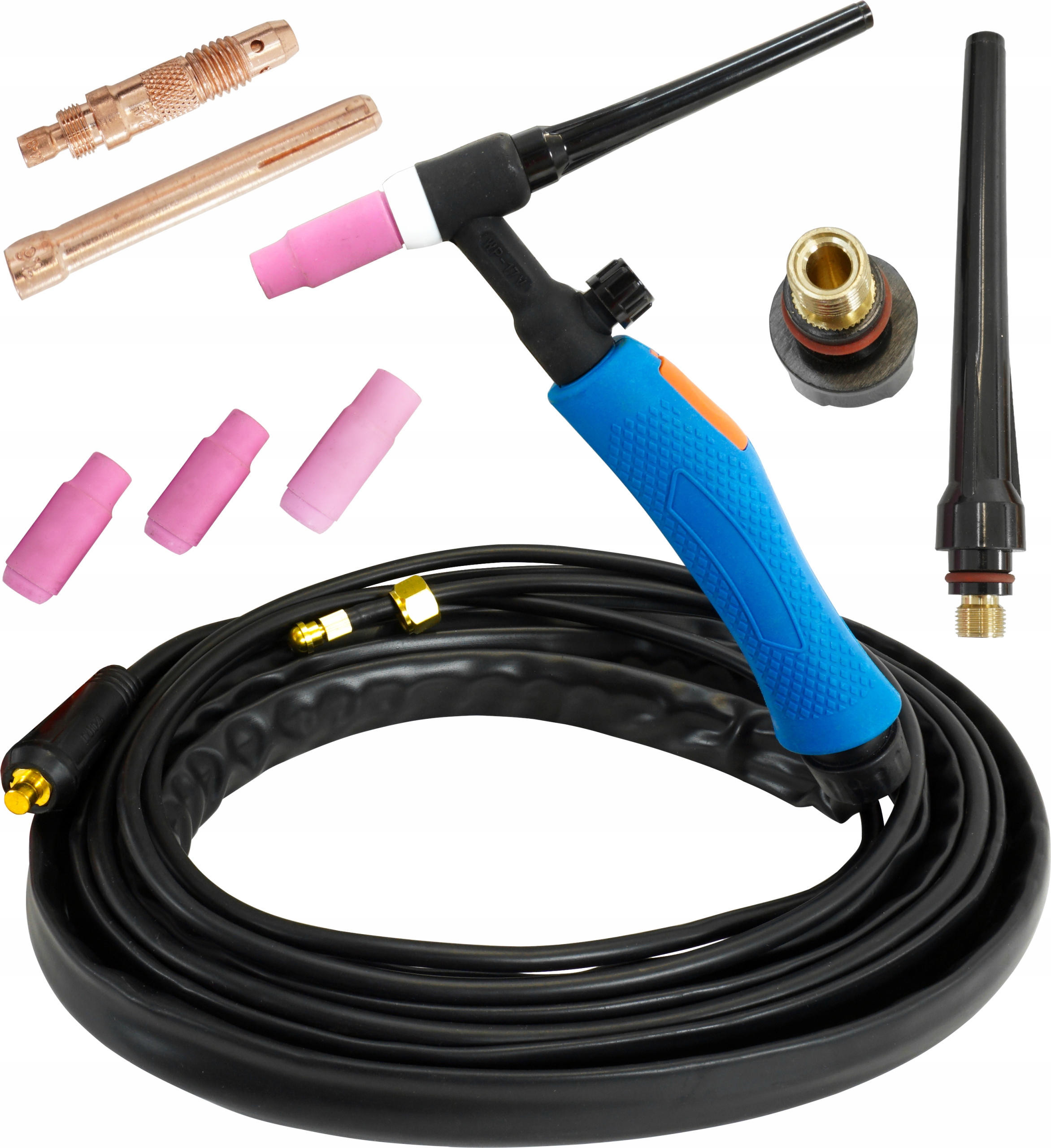 Апарат оснащений TIG< зварювальна рукоятка. /b>, з високою потужністю струму, тому вона може витримувати роботу навіть у тривалих циклах. Для початку до кожного тримача додаємо витратні матеріали, щоб тримач був озброєний і готовий до роботи. Крім того, всі запчастини ручки легкодоступні та їх можна придбати за привабливими цінами.