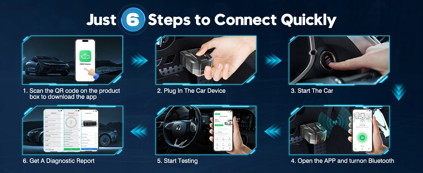 Сканер має оновлену систему Bluetooth 5.4 для швидшого та надійнішого підключення. Просто увімкніть Bluetooth у вашому автомобілі, перейдіть на сторінку програми та дочекайтеся автоматичного встановлення з’єднання. Це безперебійне з’єднання гарантує, що ви можете розпочати діагностику свого автомобіля без затримки.
