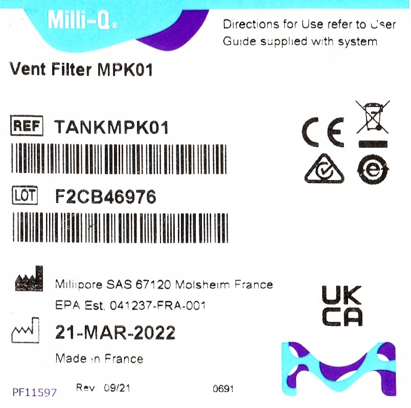 Для отримання оптимальних результатів вентиляційний фільтр замінюють раз на рік. Для використання з 30/60/100 л поліетиленовими резервуарами, які живляться чистою водою Elix® Type 2