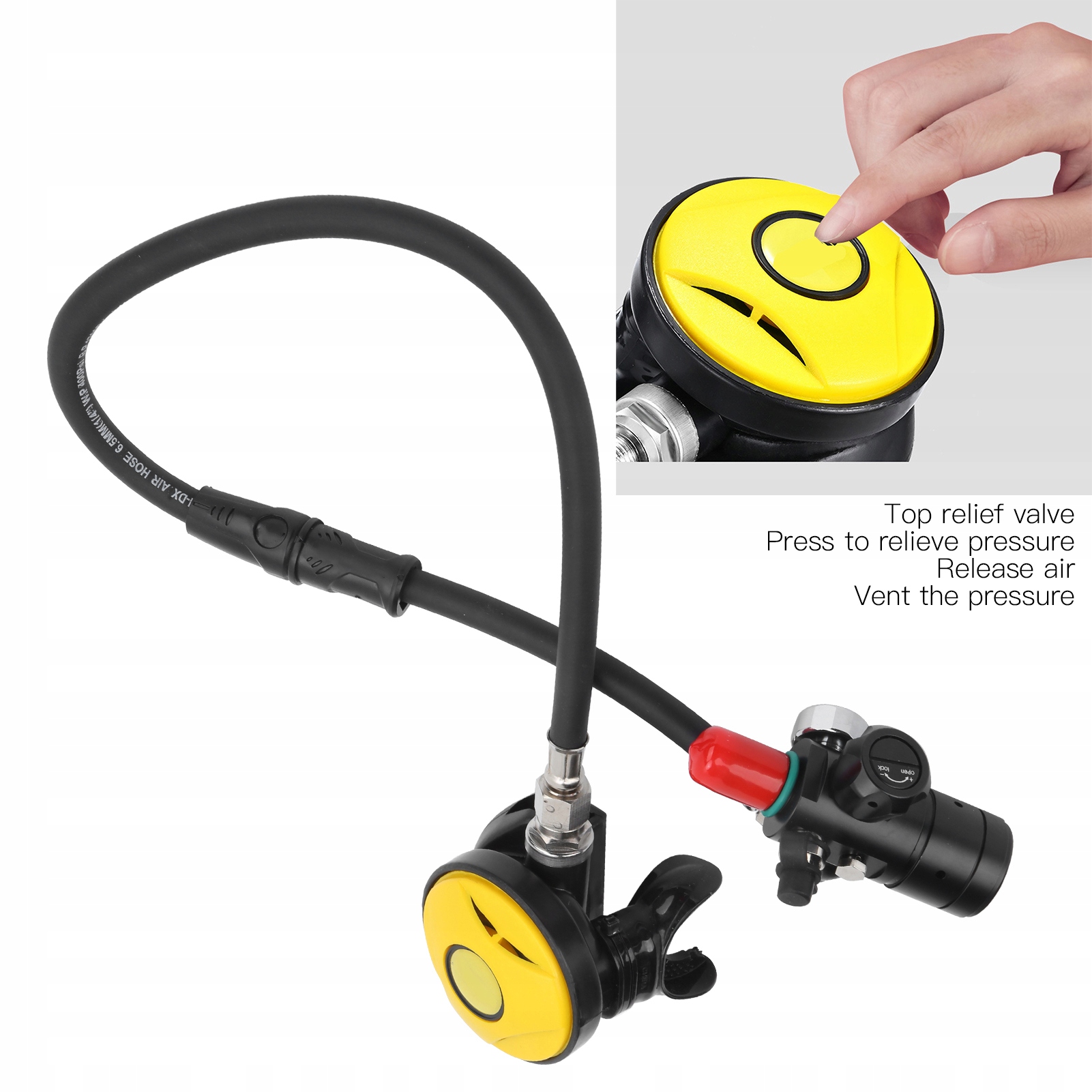 3. Клапан тиску у верхній частині дихального клапана може вивільняти тиск, звільнити повітря і знизити тиск; Один -шлях повітряний фільтр, конструкція подвійного фільтра, дихання чистого повітря; Сяючий водонепроникний манометр все ще добре видно на глибині 80 метрів.