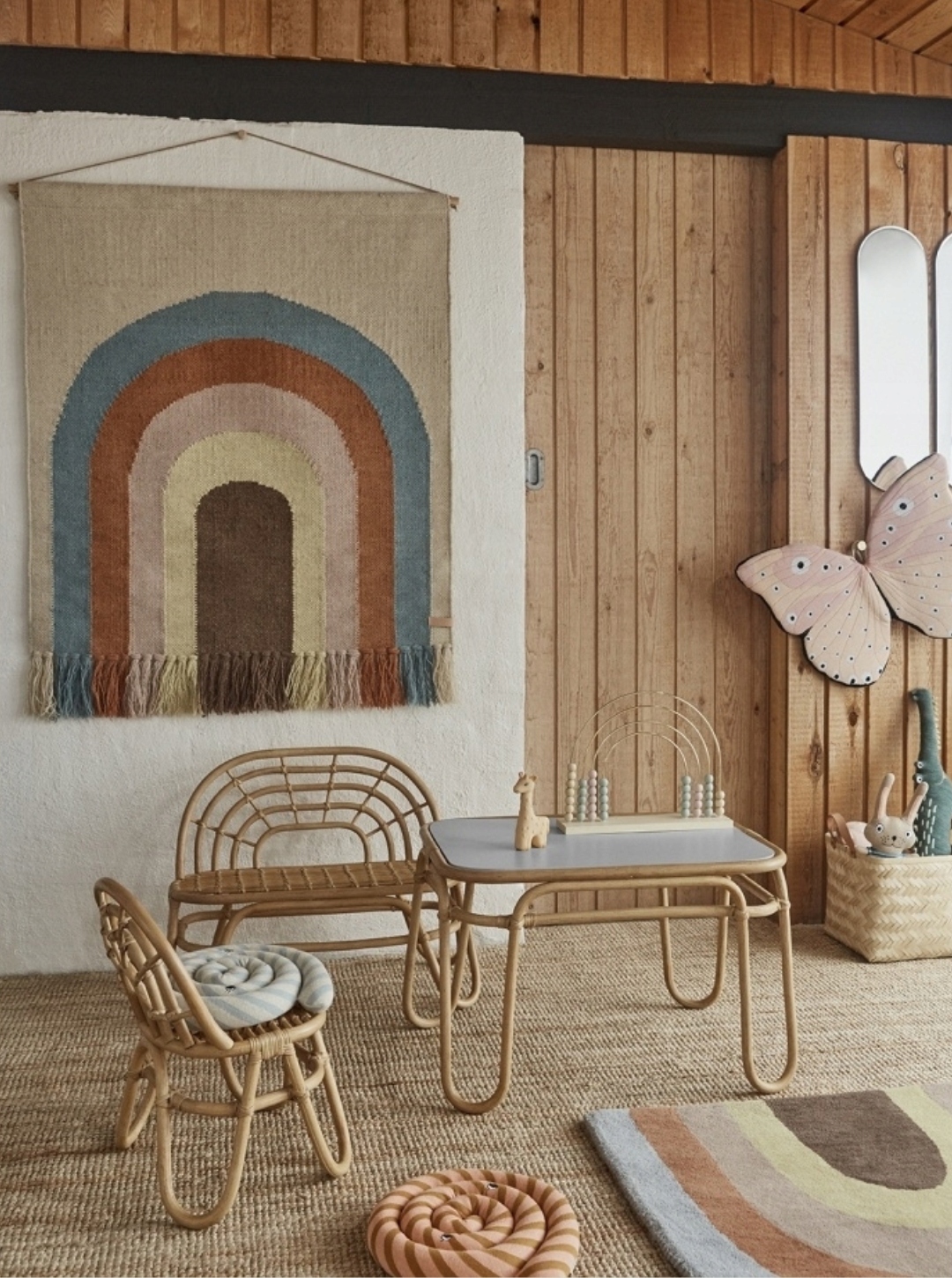Таблиця веселки - це таблиця, зроблена як частина серії. Стол можна використовувати в дитячій кімнаті, наприклад Чай -РЕКПЕКТ з ляльками. Дитина буде в захваті від невеликого столу, що стосується меблів, які мають дорослі. Таблиця може бути сприятливо пов'язана з кріслом або лавкою з тієї ж серії. Якщо таблицю слід використовувати для малювання та малювання, рекомендуємо нанести на нього скатертину або використовувати як основу однієї з популярних прокладок з дизайну Oyoy Living. Зроблено з 100% ротанга. MDF вершина. Якість: 100% Раттенський розмір: висота 48 х довжина 67 х ширина 44,5 см