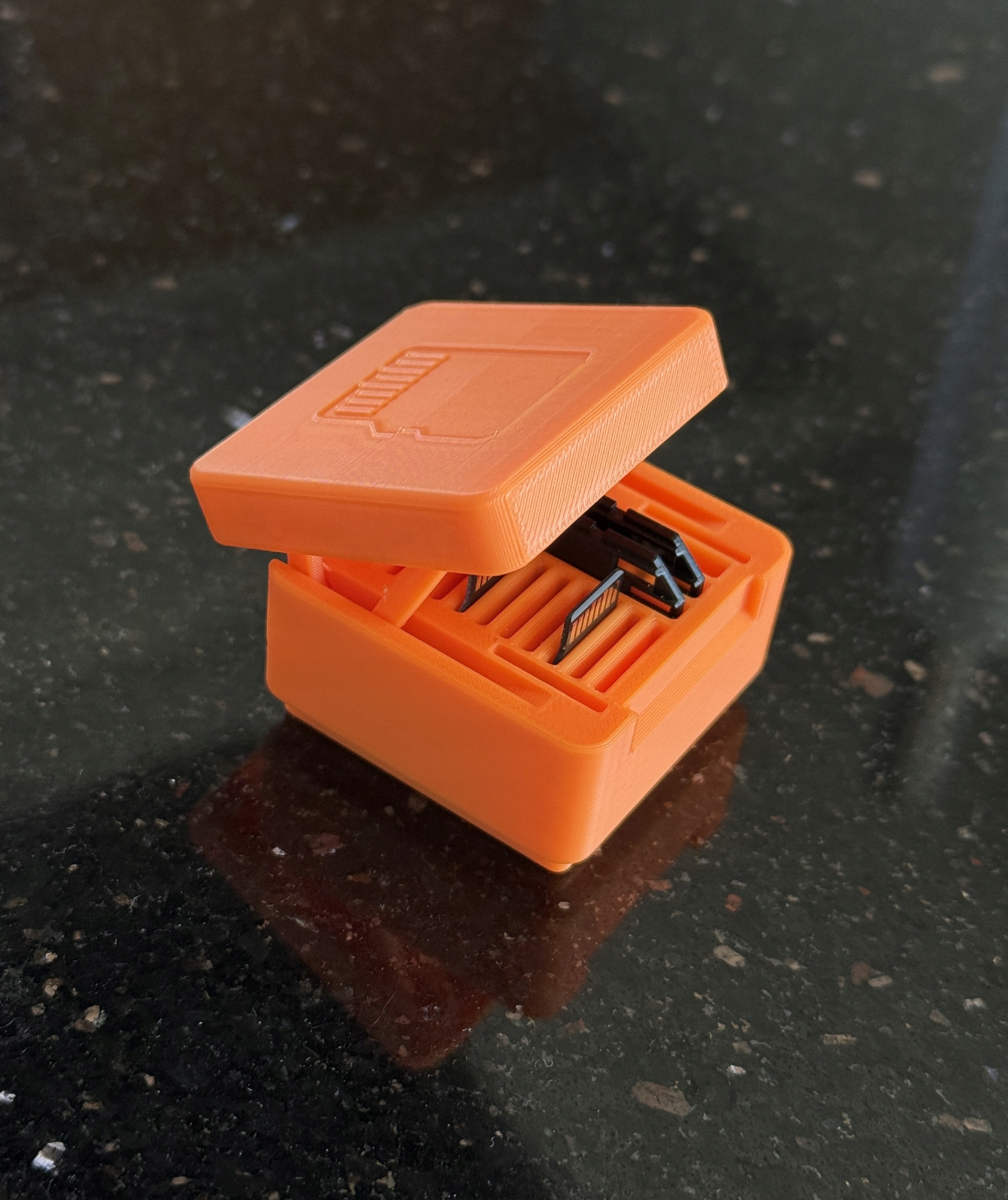 Практичний і ефективний міні-бокс для карт пам’яті, ідеальний для фотографів, творців, інженерів-електронників і всіх, хто хоче завжди мати свої картки під рукою. Виготовлений із міцного PLA+, він гарантує довговічність і стійкість до щоденного використання. Це невеликий зручний органайзер, який містить багато можливостей.