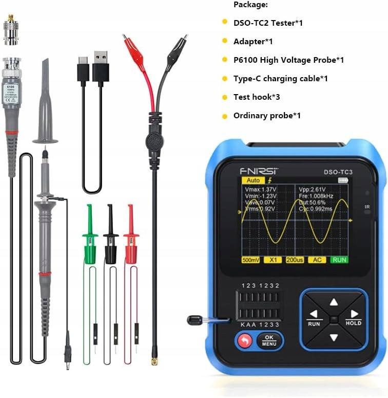 TC2 - це практичний та вигідний посібник з міні -осцилографа, призначеного для щоденного обслуговування та досліджень та розробок. Осцилоскоп має реальну частоту відбору проб 2,5 мс/с та пропускну здатність 200 кГц. З повною функцією тригера (єдиного, нормального, автоматичного) він ідеально працює як для періодичних аналогових сигналів, так і для аероіосичних цифрових сигналів. Ви можете виміряти напруги до ± 400 В. за допомогою ШІМ з квадратною хвилею, 5 В квадратної хвилі, діапазон частот 0-80 кГц, робочий цикл 0 -100%.