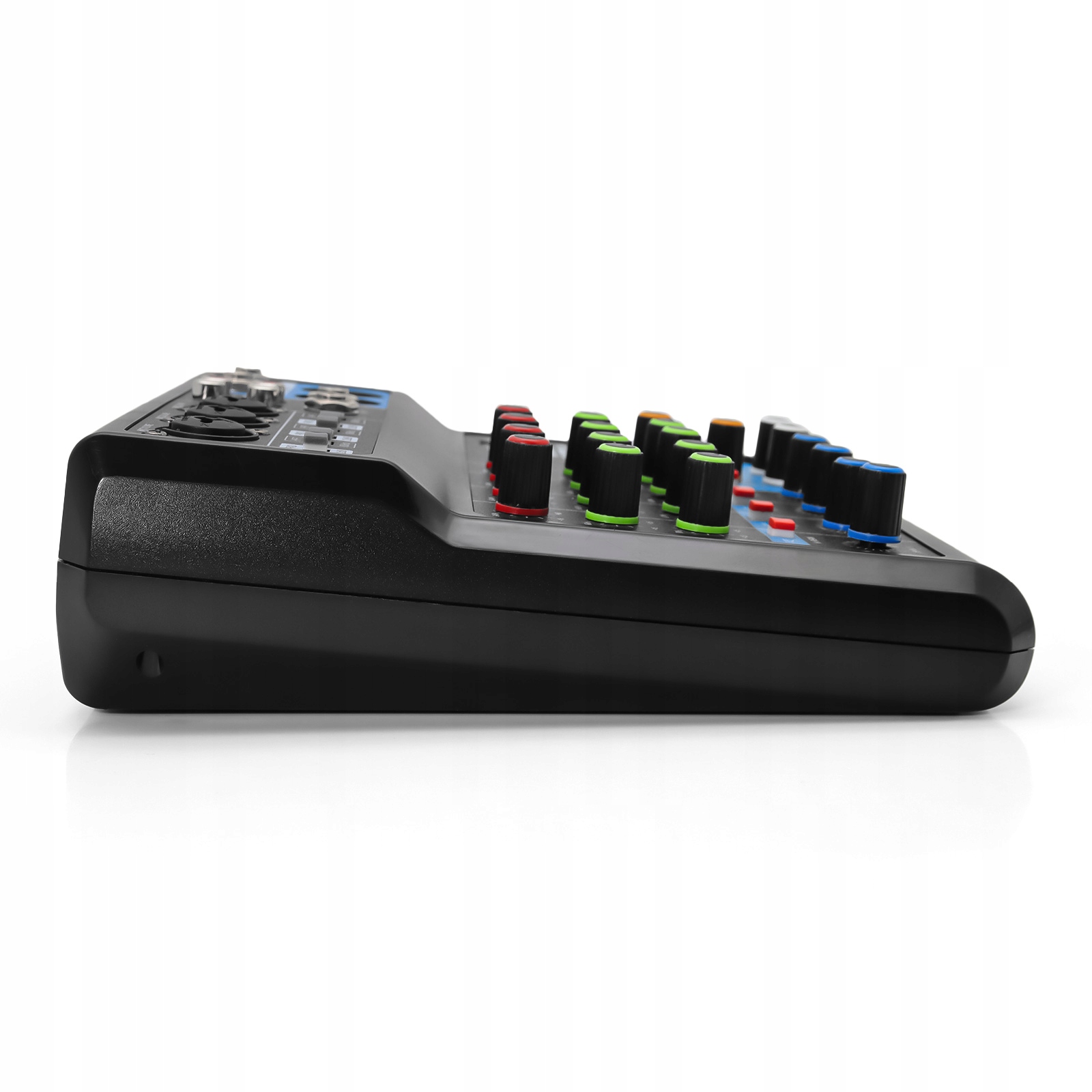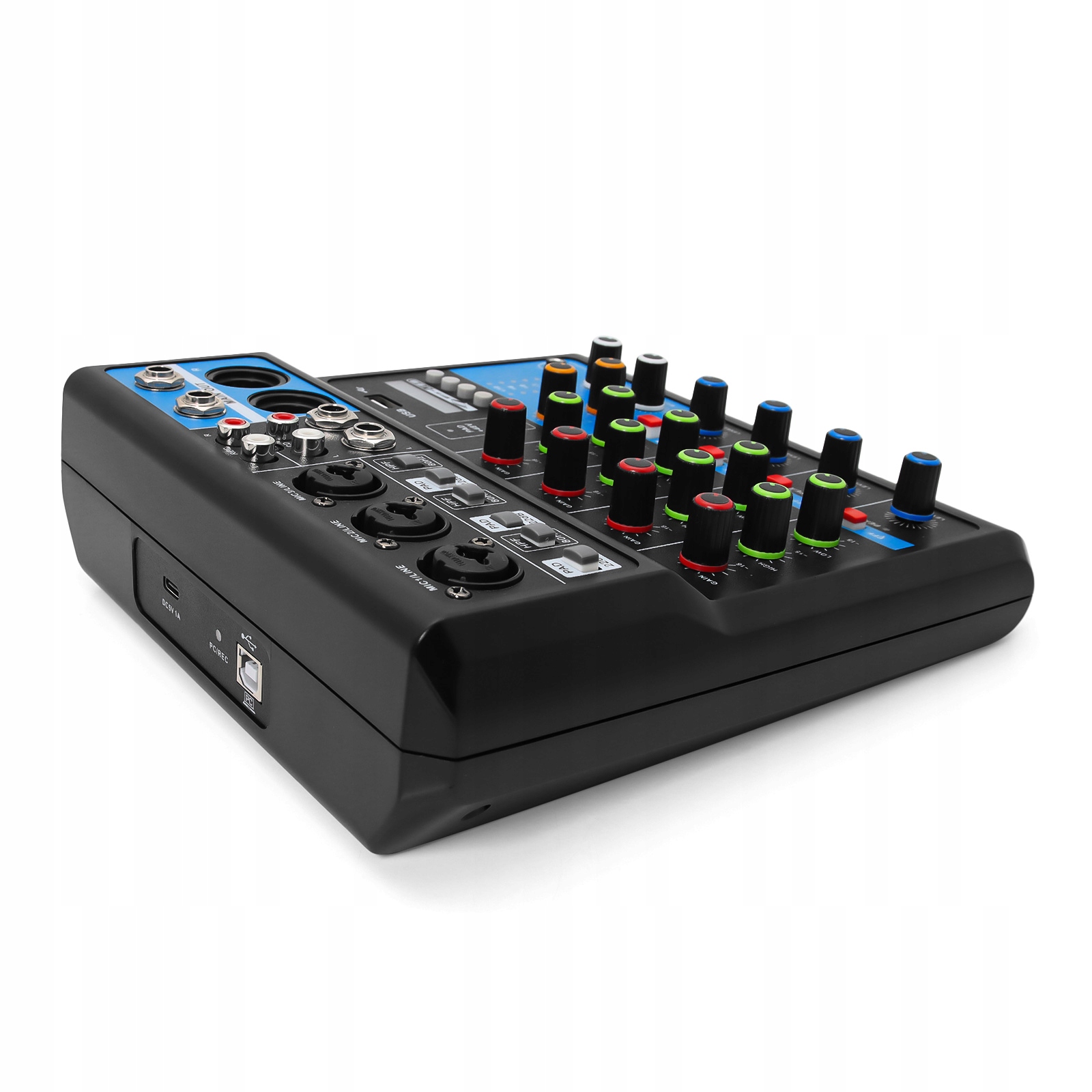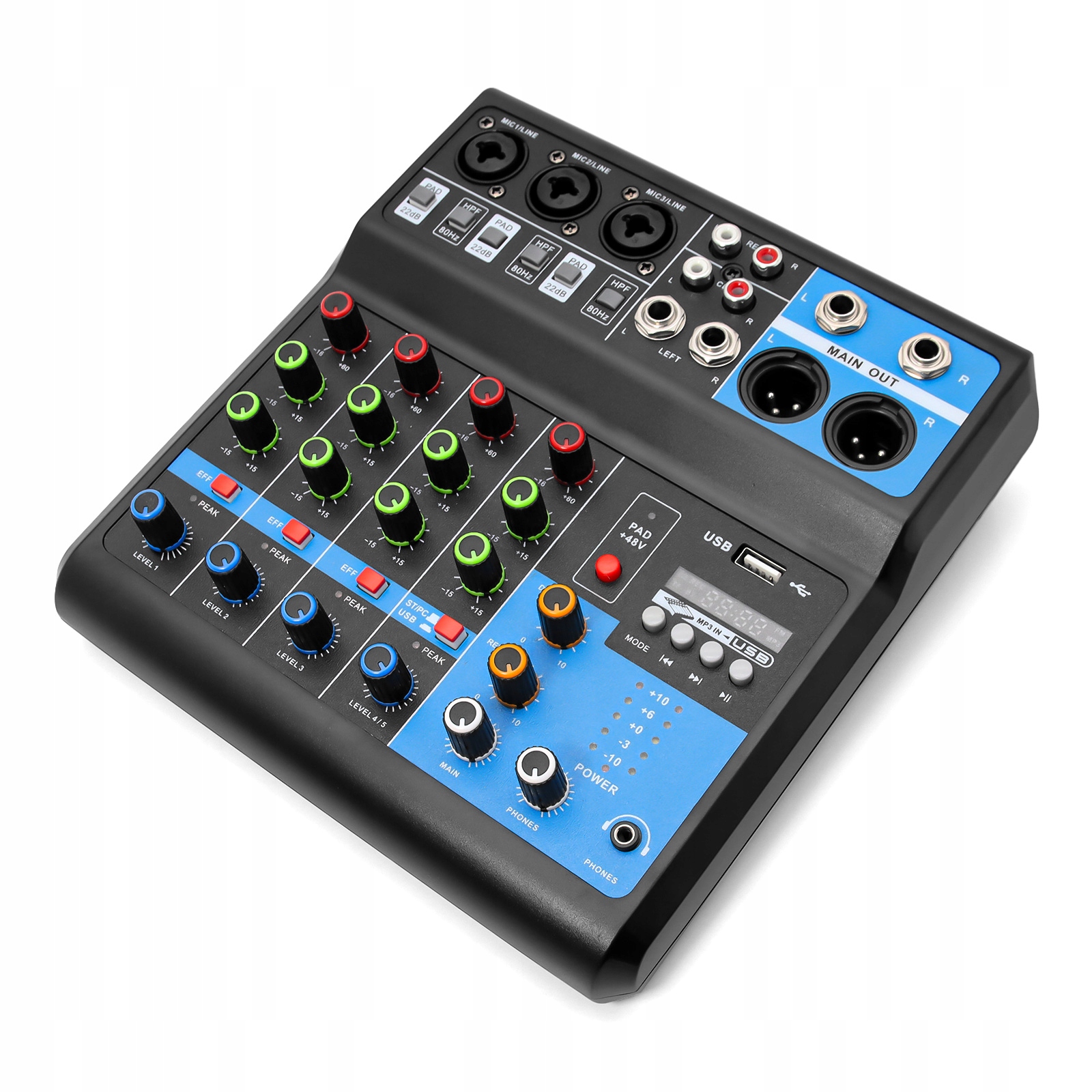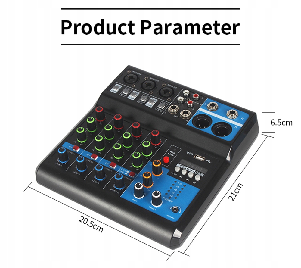 Функція: аудіомікшер із підтримкою 2 монофонічних вхідних мікрофонів XLR і 2 груп вхідних стереоканалів із кнопкою +48 В, високоточним світлодіодним індикатором пікового рівня та 3-смуговим музичним еквалайзером на всіх каналах