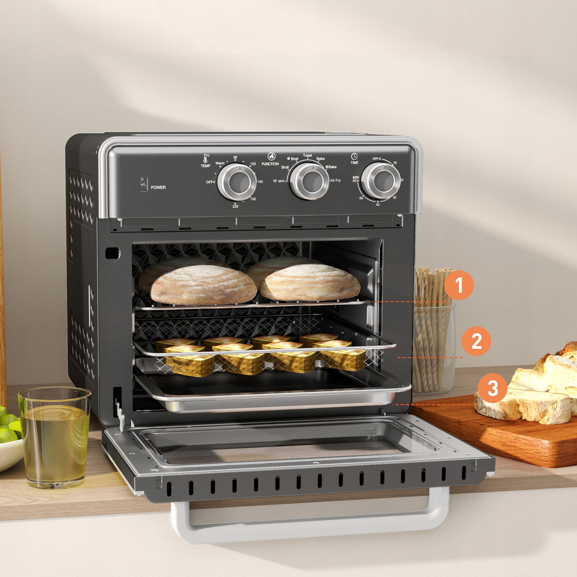 Завдяки трьома предметам на міні -духовці ви можете одночасно готувати різні страви та максимально збільшити продуктивність.