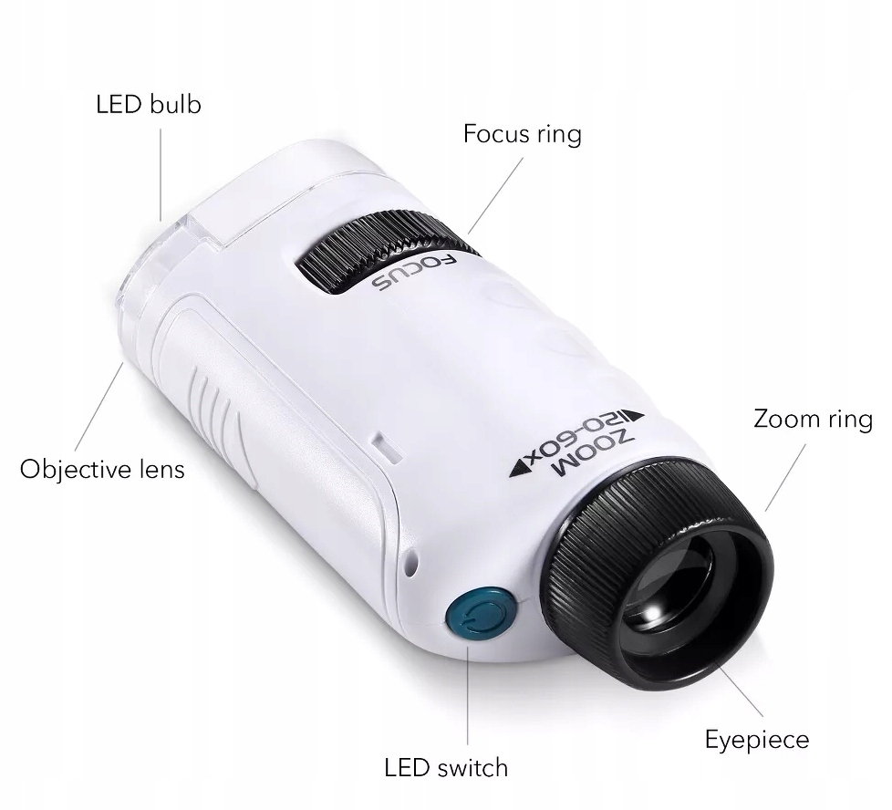 Цей портативний кишеньковий мікроскоп є ідеальним рішенням. Пропозиція для людей, які хочуть проводити спостереження на відкритому повітрі, без необхідності носити важке обладнання.