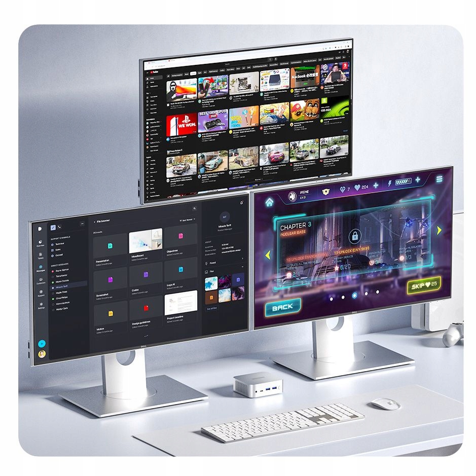 Міні-комп'ютер можна легко встановити на задній панелі монітора завдяки пластині VESA, що входить у комплект, і відповідає стандартам 75 мм і 100 мм. Це рішення дозволяє створити естетичну інтегровану робочу станцію Все-в-одному, заощаджуючи простір і позбавляючи від непотрібних кабелів на столі.
