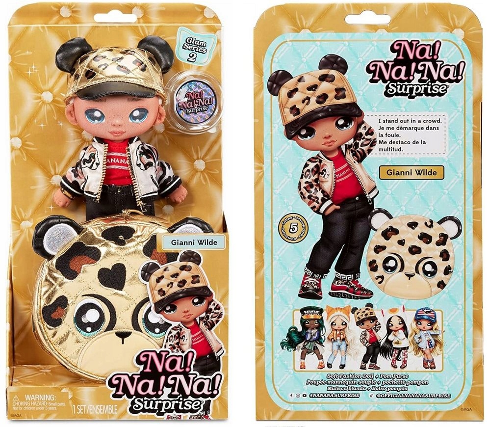 Підкоріть свій стиль разом з Na! на! на! Сюрприз - 2 в 1: лялька Soft Fashion і сумочка Glam Series 2! Будьте готові отримати подвійну вигоду з м’якою лялькою-одягненкою та колекційною металевою сумкою-застібкою з тваринним помпоном! Підніміть свій стиль на новий рівень із асортиментом Glam, який включає в себе привабливі металеві тканини для вбрання ляльок, натхненних тваринами, і сумку зі зручною милою кліпсою для тварин, яку можна прикріпити до рюкзака чи сумки. М’які ляльки з надрукованими обличчями та деталями тепер розміщені в упаковці, де ви можете бачити всі деталі, не відкриваючи, що полегшує збирання!