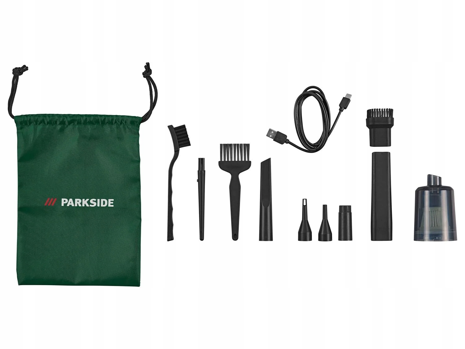 - Аксесуари: 1x контейнер для пилу з фільтром, 1x подовжувальна трубка, 1x насадка для щітки, 1x стандартна насадка для видування, 1x насадка для надування повітря, 1x насадка для надування (велика), 1x насадка для надування (мала), 1x щітка, 1x щітка підмітання, 1 кутова щітка, 1 кабель для заряджання USB-C