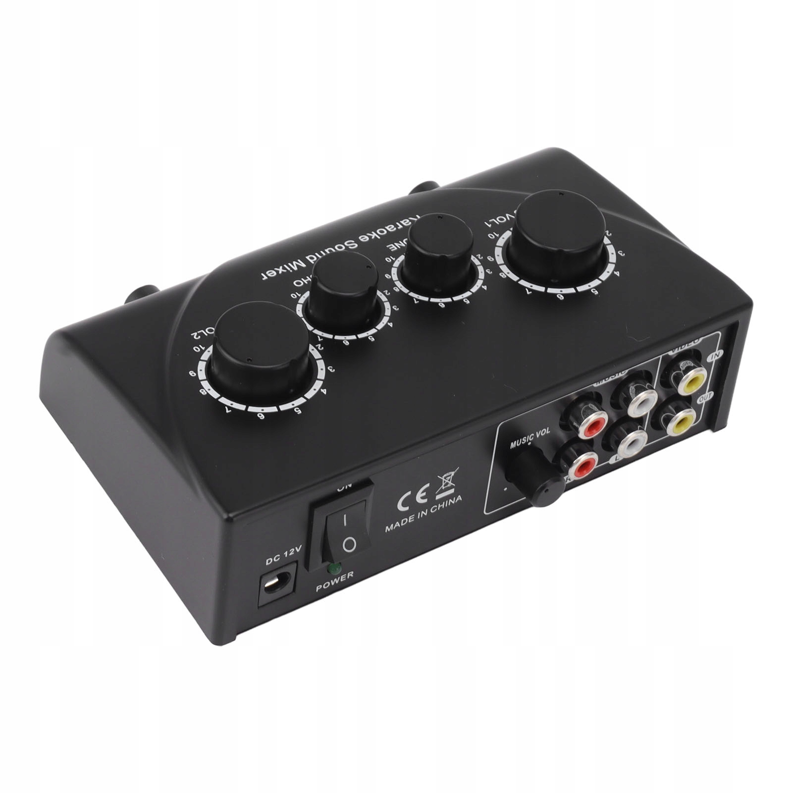 1.Звуковий мікшер для караоке: подвійний мікрофонний вхід, мікрофонний вхід 1/4 дюйма, відеовхід і аудіовихід для відеосигналів, окремий регулятор гучності. 2.4 Поворотні ручки: простий інтерфейс має 4 поворотні ручки, які можна використовувати для швидкого налаштування гучності музики, мікрофона, реверберації та тембру до бажаного рівня. 3. Висока сумісність: цей міні-портативний звуковий мікшер сумісний із телевізорами, настільними комп’ютерами, ноутбуками, планшетами, смартфонами, DVD-програвачами, системами домашнього кінотеатру, колонками тощо. 4. Широке застосування: надсилайте змішані аудіосигнали на телевізор, домашній кінотеатр чи інші звукові системи. Він дуже підходить для ді-джеїв, музики, компаній, сцен, караоке-залів, сімейних зустрічей тощо. 5. Маленький і портативний: ви можете носити міні-мікшер звуку з собою та насолоджуватися караоке чи промовами на будь-якій сцені. Ви можете легко насолоджуватися миттєвим караоке.