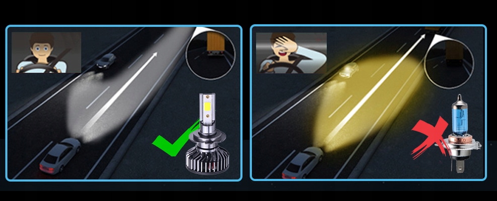 Інтелектуальна , чіп -дві -сценічні системи охолодження з тепловіддачем, висока продуктивність, відсутність перешкод радіо FM/CB і не впливають на вигорання, як у випадку з ксеноном та традиційними галогенними цибулинами. фари.
