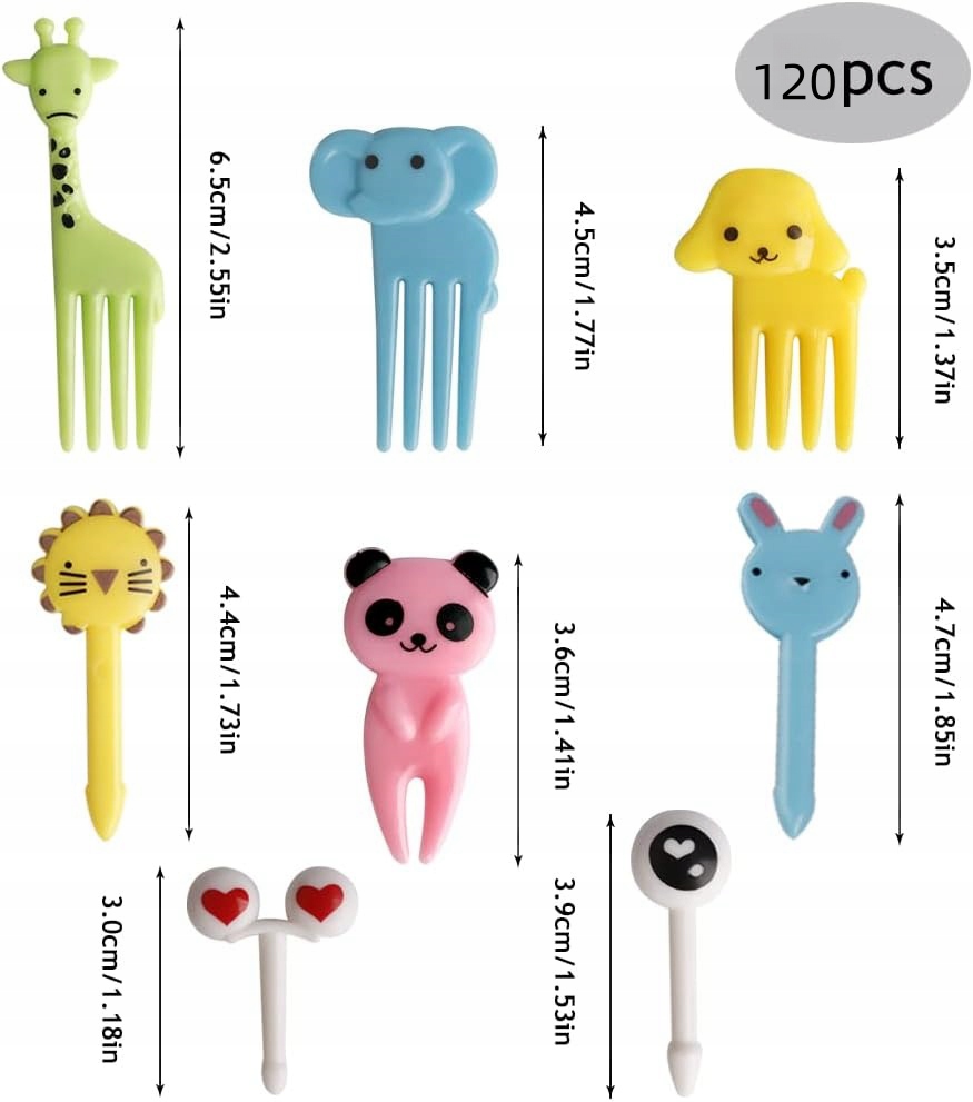 Набір фруктових виделок із 120 предметів: Наша мультяшна фруктова виделка містить різноманітні види тварин. Звірині стилі включають котів, цуценят, жирафів, слонів, кроликів, левів і панд, які популярні серед дітей. Є багато стилів, тому діти можуть вибрати свою улюблену виделку для фруктів.