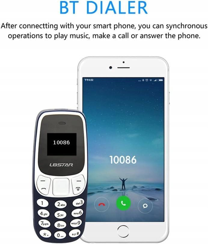 Мініатюрний телефон L8STAR BM10 - це не просто гаджет, а повноцінний мобільний телефон з цікавими функціями. Завдяки функції Bluetooth ви також можете використовувати його як гарнітуру для основного смартфона. Зміна голосу розважить вас і ваших друзів, а можливість запису розмов стане в нагоді в багатьох ситуаціях. Ультракомпактний розмір робить його ідеальним телефоном для подорожей чи вечірок