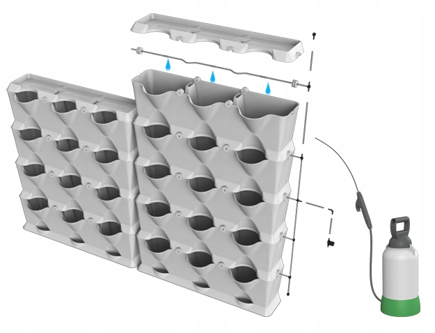Зрошувальна система (доступна для придбання як окремий продукт) складається з мікротрубок із зовнішнім діаметром 6,5 мм із вбудованими крапельницями, які розміщені всередині кожного модуля. Його можна підключити до ручного розпилювача або безпосередньо до основного водопроводу.