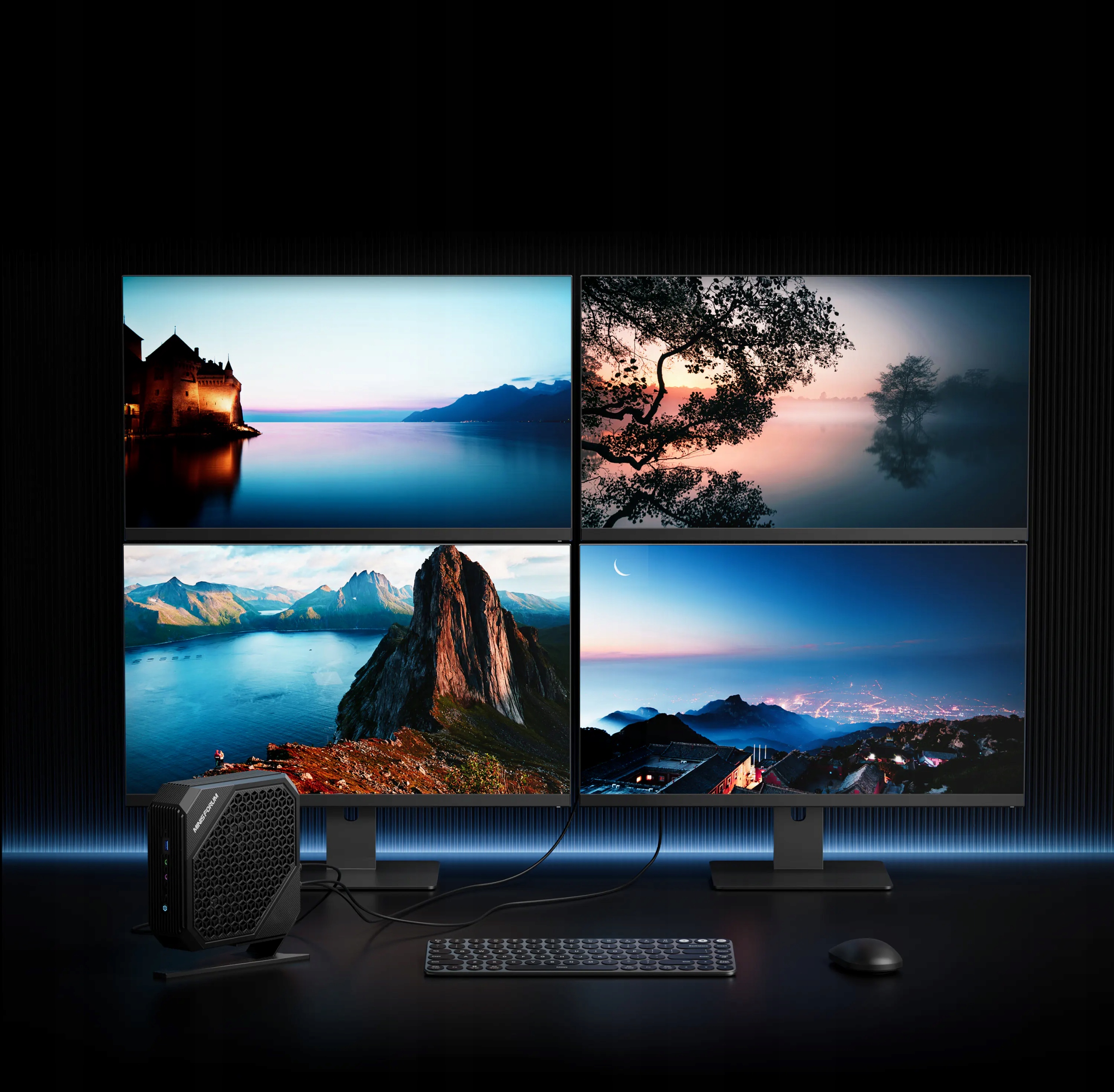 Комп'ютер дозволяє підключати аж чотири монітори одночасно з використанням 2x hdmi і 2x USB-C із підтримкою зображення. Це ідеальне рішення для багатоекранних робіт, аналізу даних, програмування, творчої роботи чи розваг з повним зануренням у вміст.
