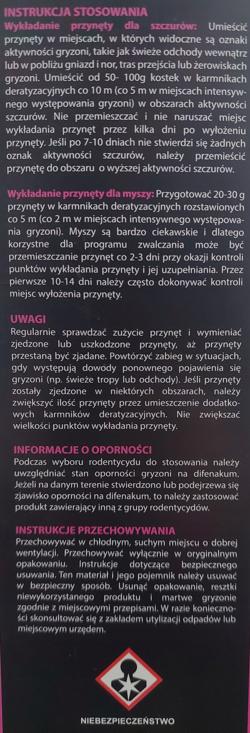 При застосуванні використовуйте захисні рукавички. Ретельно вимийте руки після закінчення роботи. Продукт містить бромадіолону - гірку речовину, яка запобігає випадковому споживанню дітьми та тваринами.