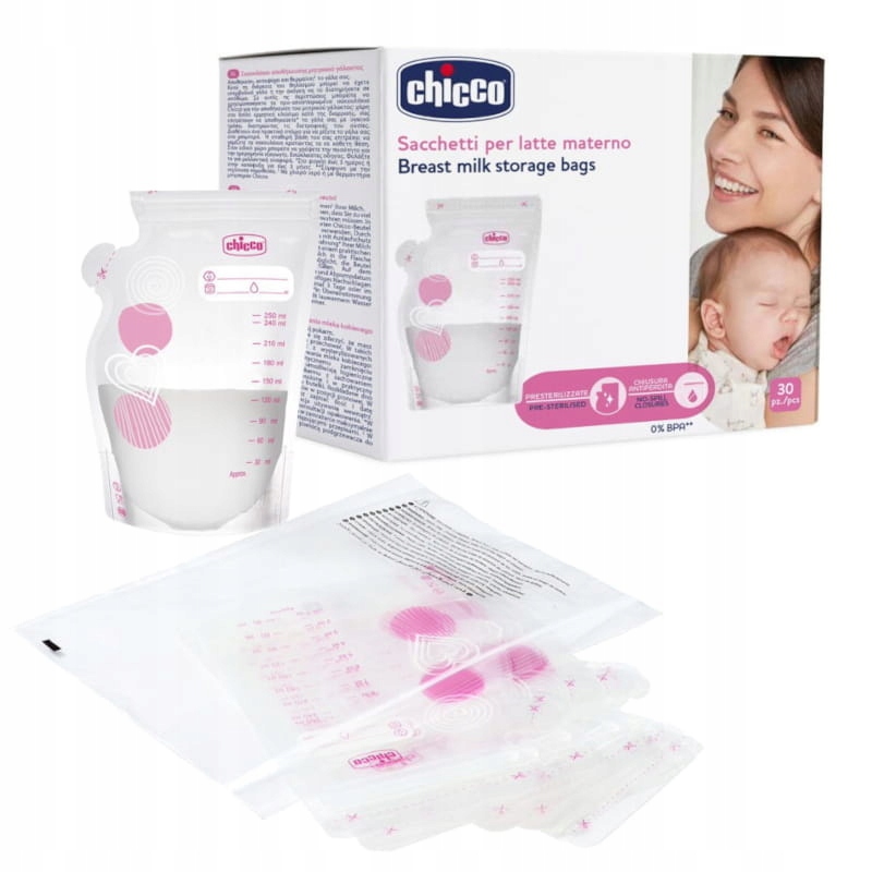 Chicco Milk Storage Bags — це набір із 30 стерильних пакетів ємністю 250 мл кожен, готовий до використання відразу після відкриття упаковки. Підходять для зберігання молока в морозильній камері (до 3 місяців) і в холодильнику (до 3 днів).
