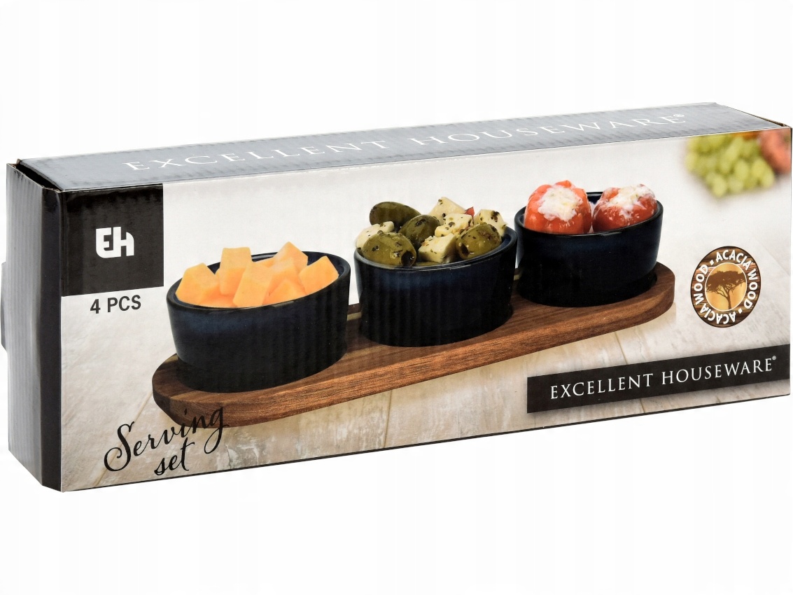 Набір із 3 керамічних мисок на підносі з дерева акації — для подачі оливок, горіхів, закусок і соусів. Також ідеально підходить для солодких міні-десертів.