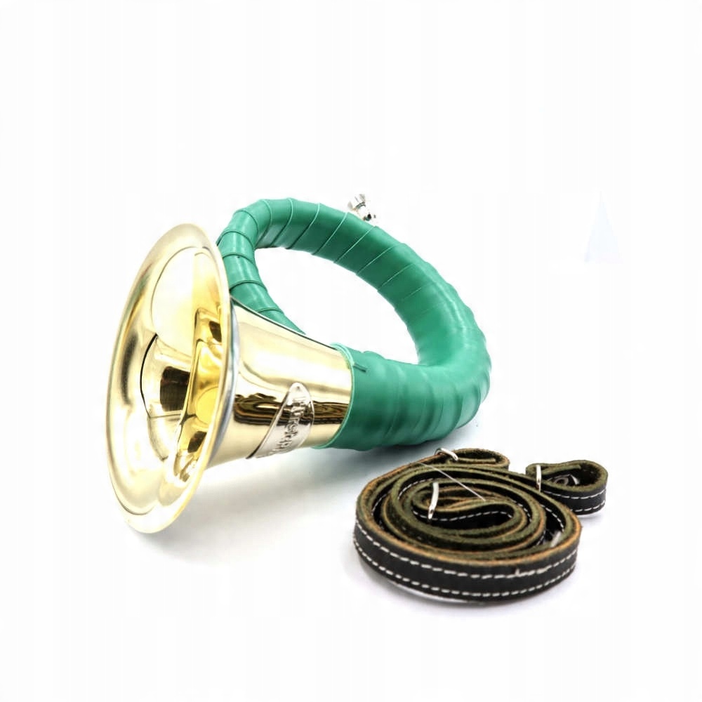Мисливський ріг виготовлений з високоякісної латуні, обтягнутий м'якою екологічною шкірою зеленого кольору. Він славиться чудовим і чистим звуком, а також міцний і стійкий до корозії.