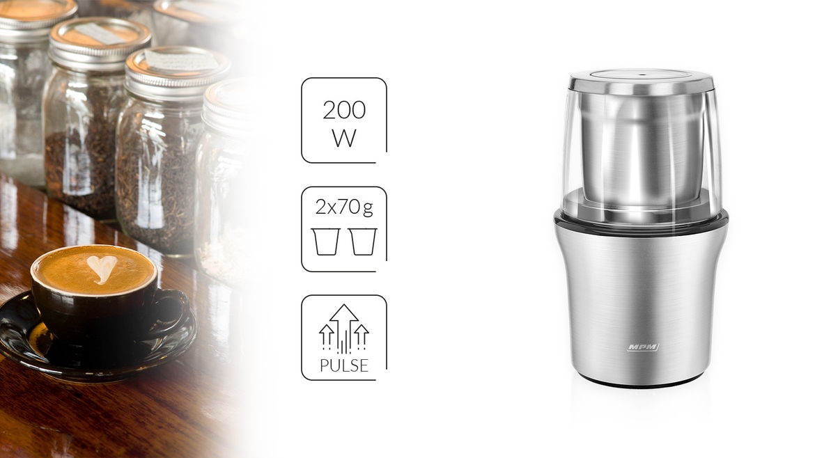 ММК-06М оснащена двома ємностями з нержавіючої сталі. Ємність з двома лезами ідеально підходить для помелу кавових зерен. Другий, оснащений чотирма лезами, ідеально підходить для подрібнення злаків, горіхів або трав. Насолоджуйтеся смаком і ароматом харчових продуктів. Подрібнюють і подрібнюють до отримання натурального, повноцінного продукту. Також прилад стане в нагоді тим, хто сидить на безглютеновій дієті та виготовляє борошно самостійно, наприклад, із спельти.