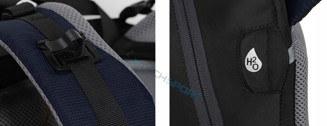 Ремінь грудної клітки має гнучку секцію, яка дозволяє вільно дихати та вертикальну систему регулювання. У пряжку було вбудовано рятувальний свист: