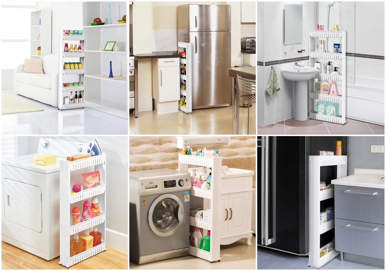 Полицю розроблено так, щоб використовувати переваги вузького простору, наприклад, між холодильником і шафою або між пральною машиною та шафою. Полиця має 3 глибокі полиці, які дозволять розмістити багато речей, наприклад, кухонне приладдя, пляшки, спеції. Він також чудово підійде як полиця для ванної кімнати для косметики, паперу, рідин або порошків. Використання 4 коліщаток дозволить легко і швидко переміщати полицю.