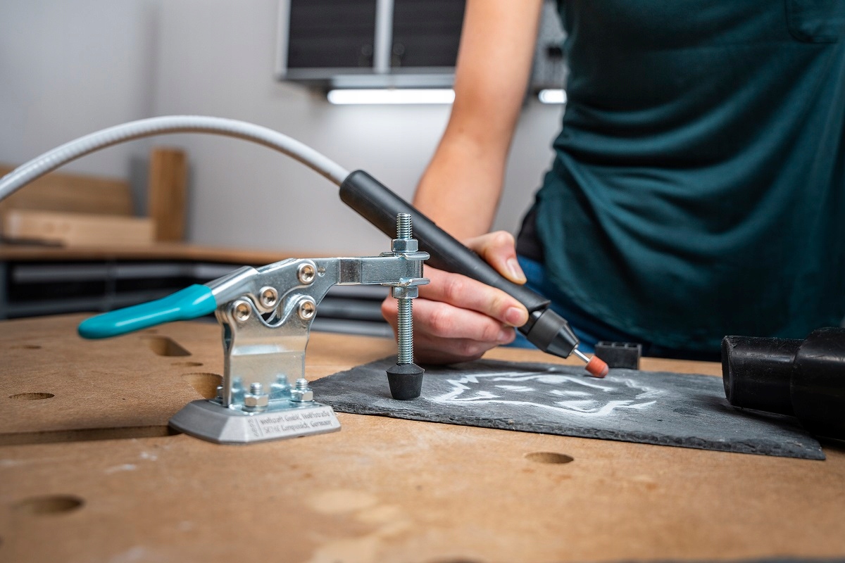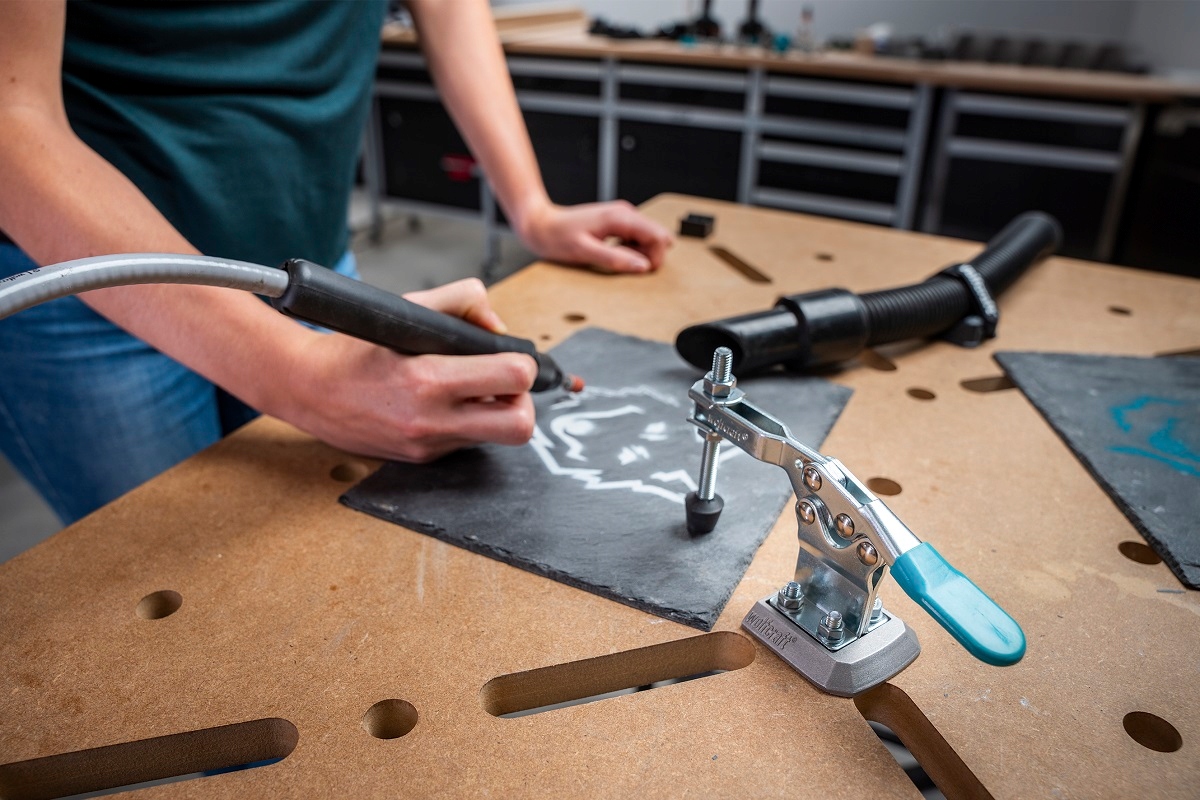 Мобільний затискач швидкий -плакат, виготовлений із сталі, ідеально підходить для всіх проектів, що потребують безпечного кріплення та роботи з заготовкою. Стискання можна заблокувати за кілька секунд за допомогою алюмінієвої дошки з алюмінієвим адаптером у всіх таблицях з 20 мм отворами. Для цього просто підключіть і затягніть гвинт під робочою стійкою. Ергономічна ручка забезпечує цю діяльність швидко, безпечно та зручно. Завдяки цьому вкладенню ми отримаємо тиск до 150 кг. Мобільний затискач Fast -fuel ідеально підходить для серійної роботи. Крім того, ви також можете зняти адаптерну плату та накрутити мобільний затискач безпосередньо до робочої стільниці чотирма гвинтами. Діапазон затискача від 0 до 38 мм може бути плавно відрегульований за допомогою різьбового стебла залежно від товщини заготовки. Завдяки досяжності від 25 до 65 мм, це дозволяє універсально використовувати для багатьох завдань, пов’язаних із затисканням. Для оптимального зчеплення операція проводиться за допомогою важеля затискання, покритого гумовим покриттям з ПВХ. Оправка тиску виготовлена з високоякісного пластику NBR, який забезпечує безпечне для поверхонь і не -ковзання кріплення заготовки.
