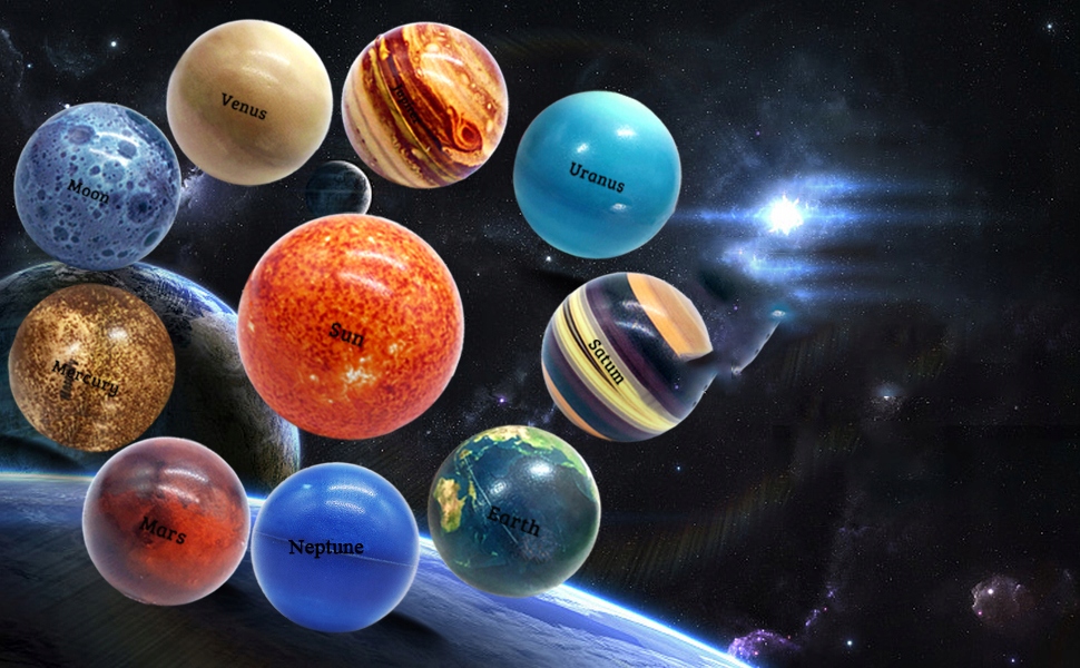 М’ячі для зняття стресу: м’ячі сонячної системи дуже гнучкі та виготовлені з високоякісного матеріалу. матеріал. Якщо ви відчуваєте тривогу або стрес, використовуйте їх, щоб заспокоїтися. Їх також можна використовувати для реабілітації рук і тренування концентрації у дітей.