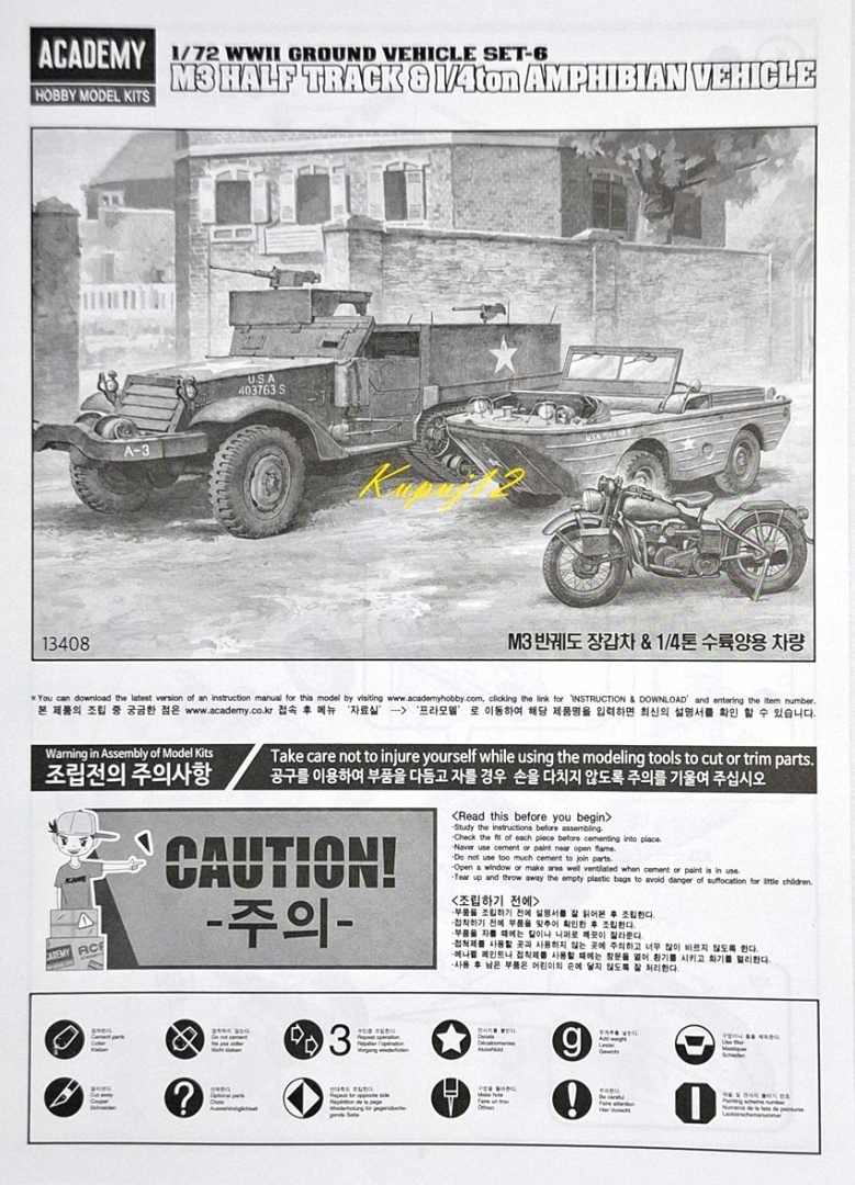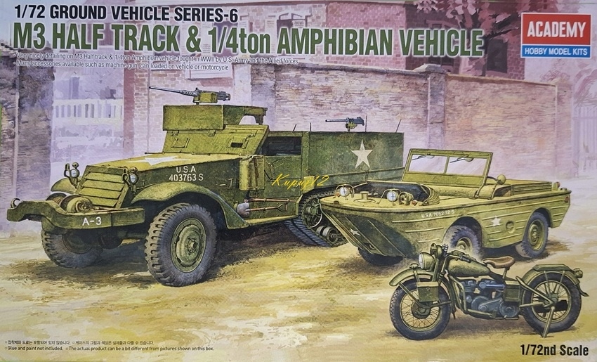 Модель транспортера-амфібії, M3 Half Track & 14-тонний двигун Amphibion Vehicle Academy Scale 1:72 і набір аксесуарів для її обробки.