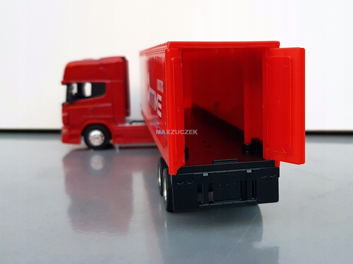 - Модель виконана з металу з пластиком. Має двері, що відкриваються в задній частині причепа, і гумові шини.