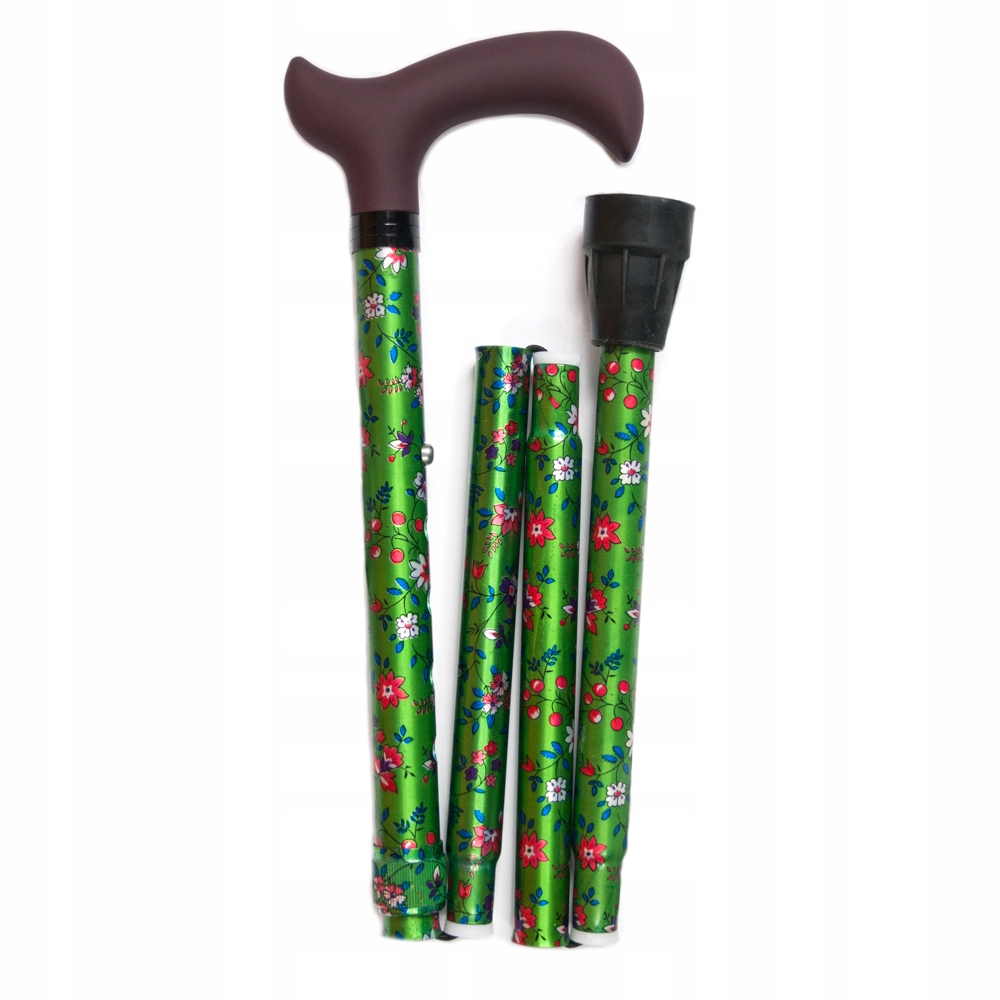 Елегантна складна палиця для підтримки, з регулюванням висоти. Дербі -тримач, виготовлений з коричневого пластику, навіть відповідає навіть великій руці. Ядро алюмінієвої пташеня, злегка мерехтіння в унікальному барвистому малюнку.