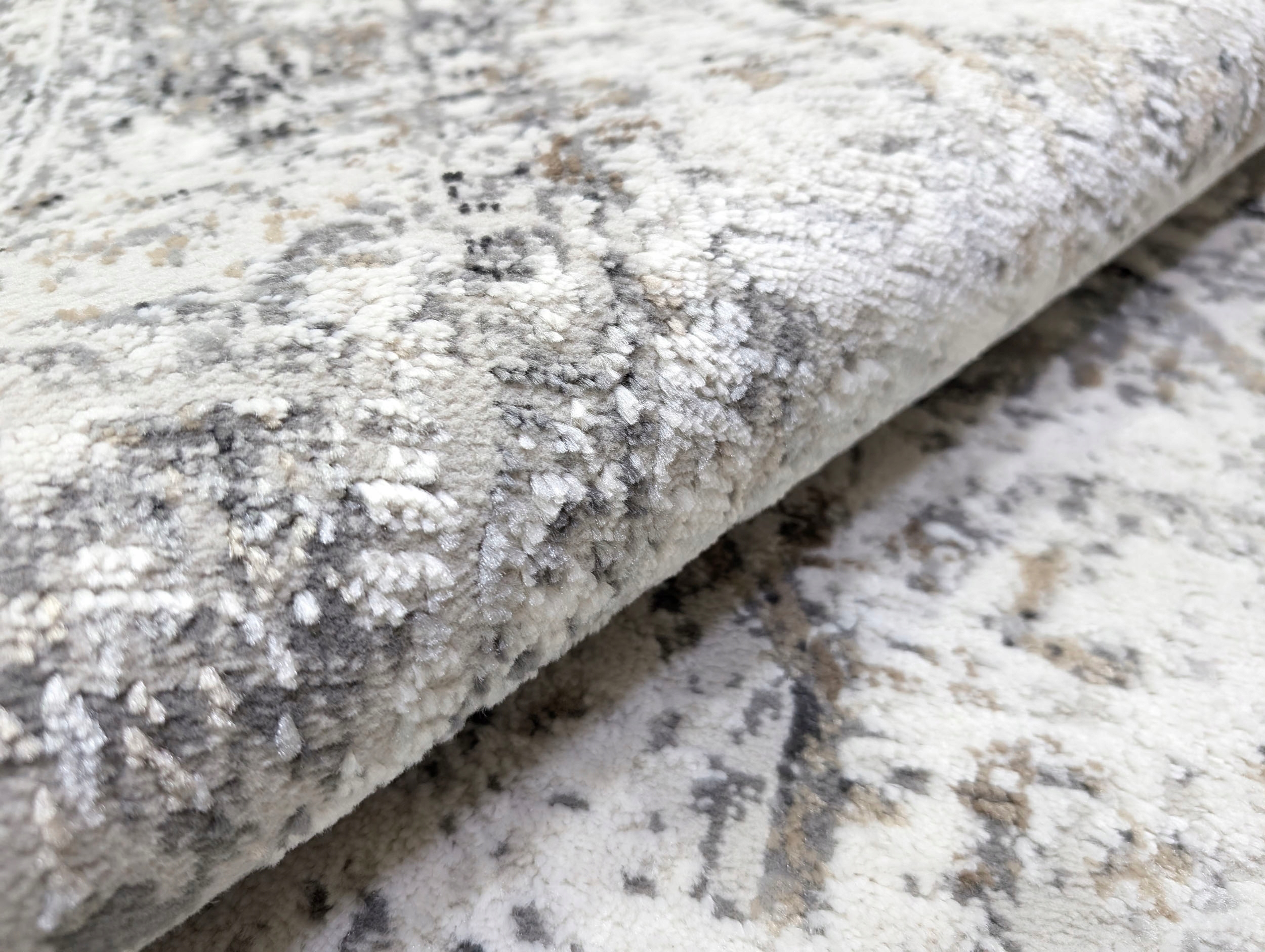 Домінуючий відтінок сірого є універсальним і ідеально гармонізується з різними композиціями - від класичного до сучасного. Ніжні потертості та хитромудро оформлені візерунки дають йому справжній шарм і роблять його схожим на справжню перлину, зняту з минулих десятиліть.