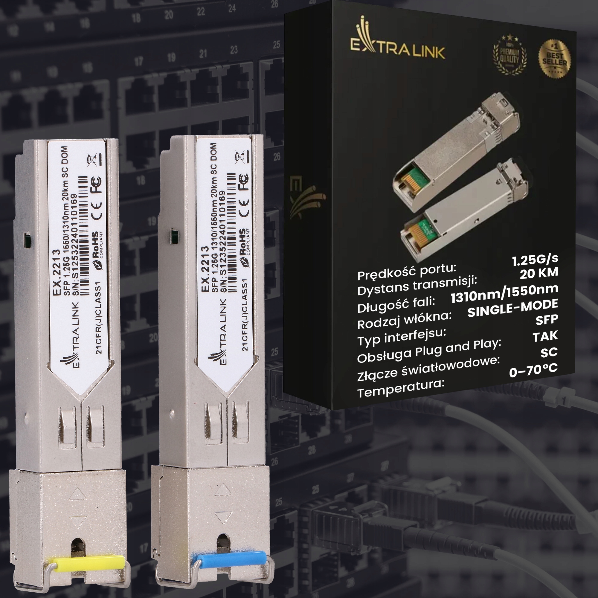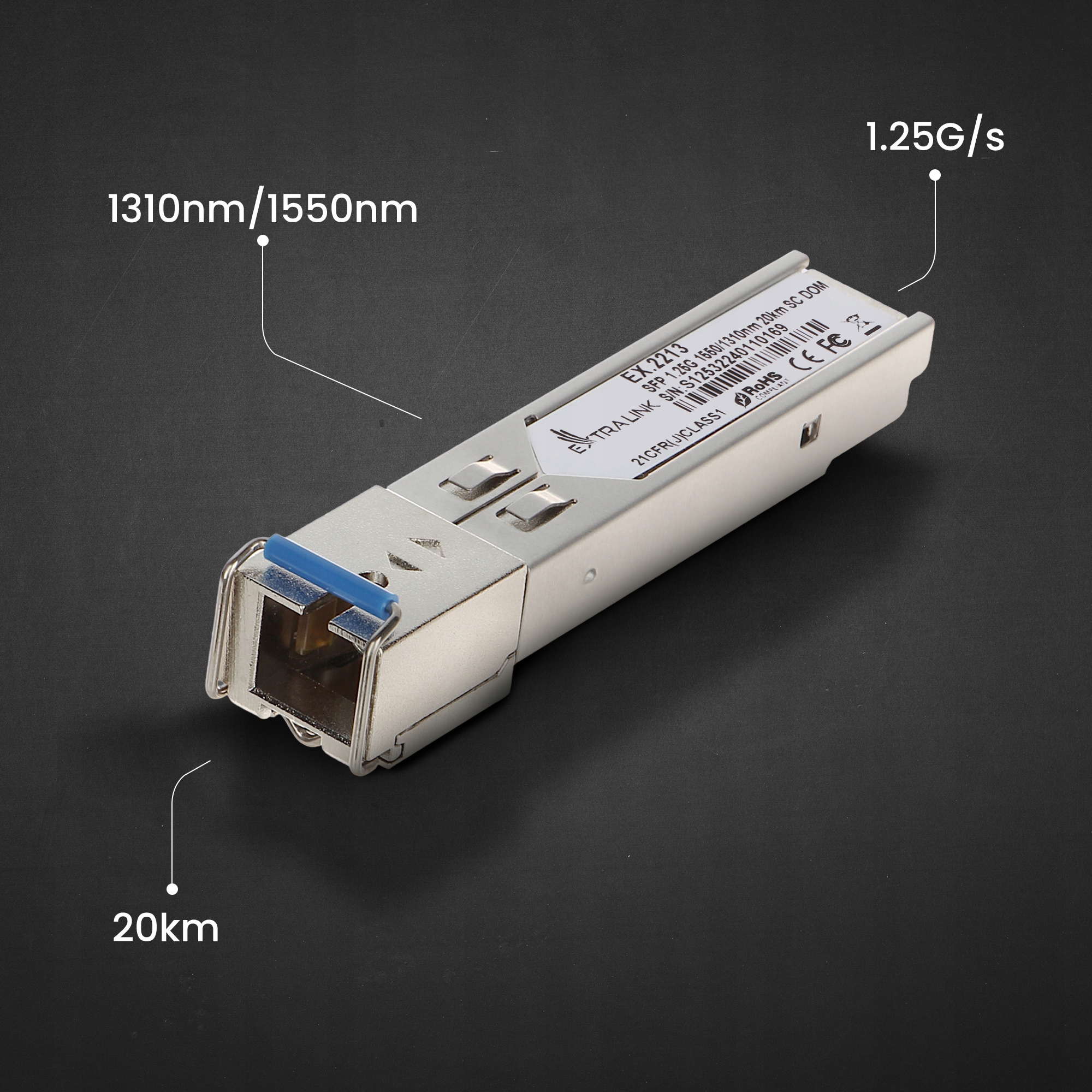 Двонаправлені модулі SFP – це високопродуктивні, економічно ефективні одномодові SFP-вставки, які підтримують швидкість передачі даних 1,25 Гбіт/с/1,0625 Гбіт/с і дальність передачі до 20 км за допомогою SMF. Волоконно-оптичний модуль SFP складається з трьох секцій, тобто лазерного передавача FP, фотодіода PIN, інтегрованого з трансімпедансним попереднім підсилювачем (TIA), і блоку керування MCU. Усі оптичні модулі SFP відповідають вимогам лазерної безпеки класу I. Двонаправлені модулі 1.25G SFP сумісні з SONET OC-24-LR-1 і директивою RoHS.