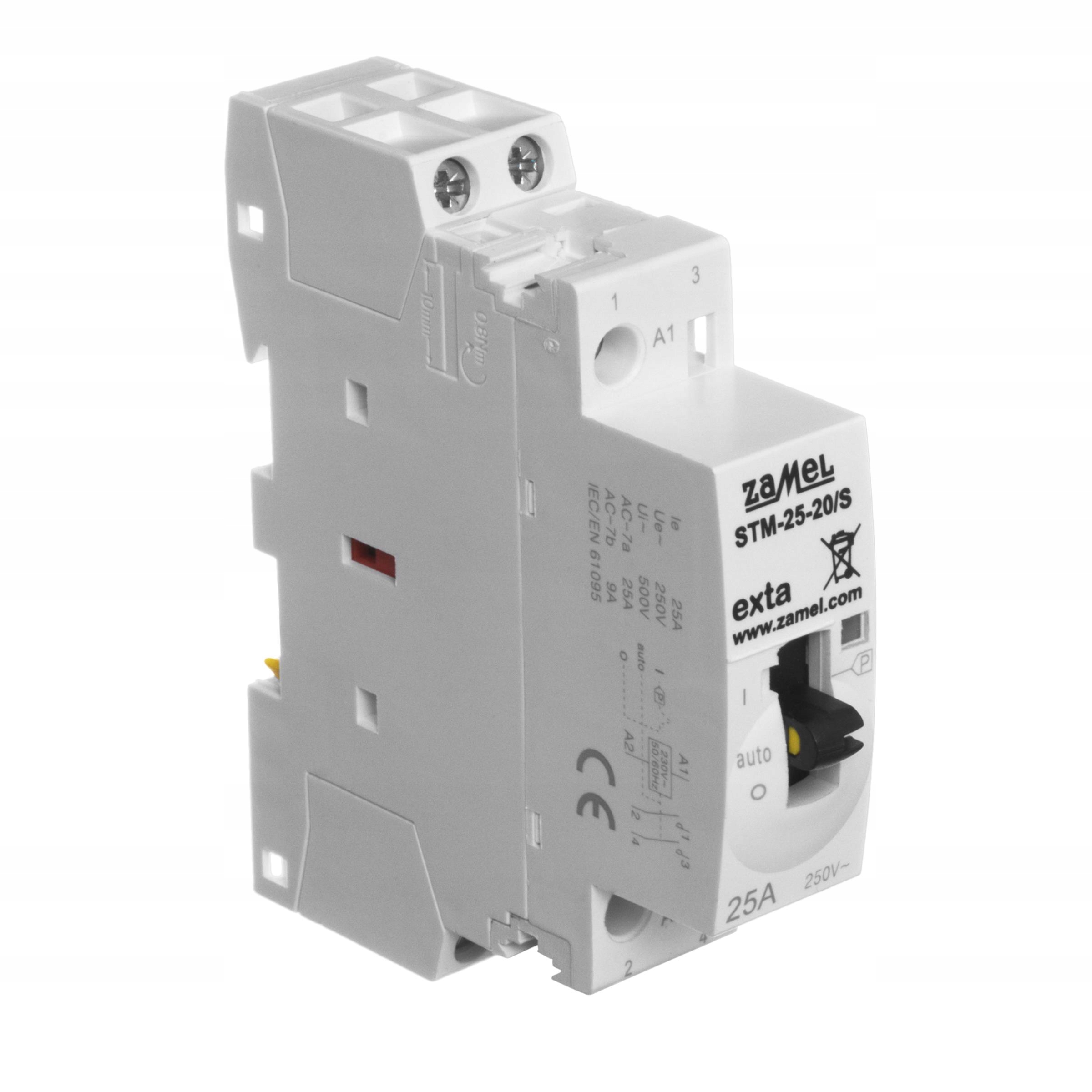 STM-25-20/S, окрім модульної конструкції, має ручний перемикач для ввімкнення та вимкнення контактора. Електромагнітні модульні монтажні контактори серії STM використовуються в основному як елемент автоматизації та управління в побутових і промислових установках. Найчастіше вони використовуються, коли є потреба керувати більшими струмами навантаження приймача електричної енергії за допомогою низьких напруг або контрольних струмів.